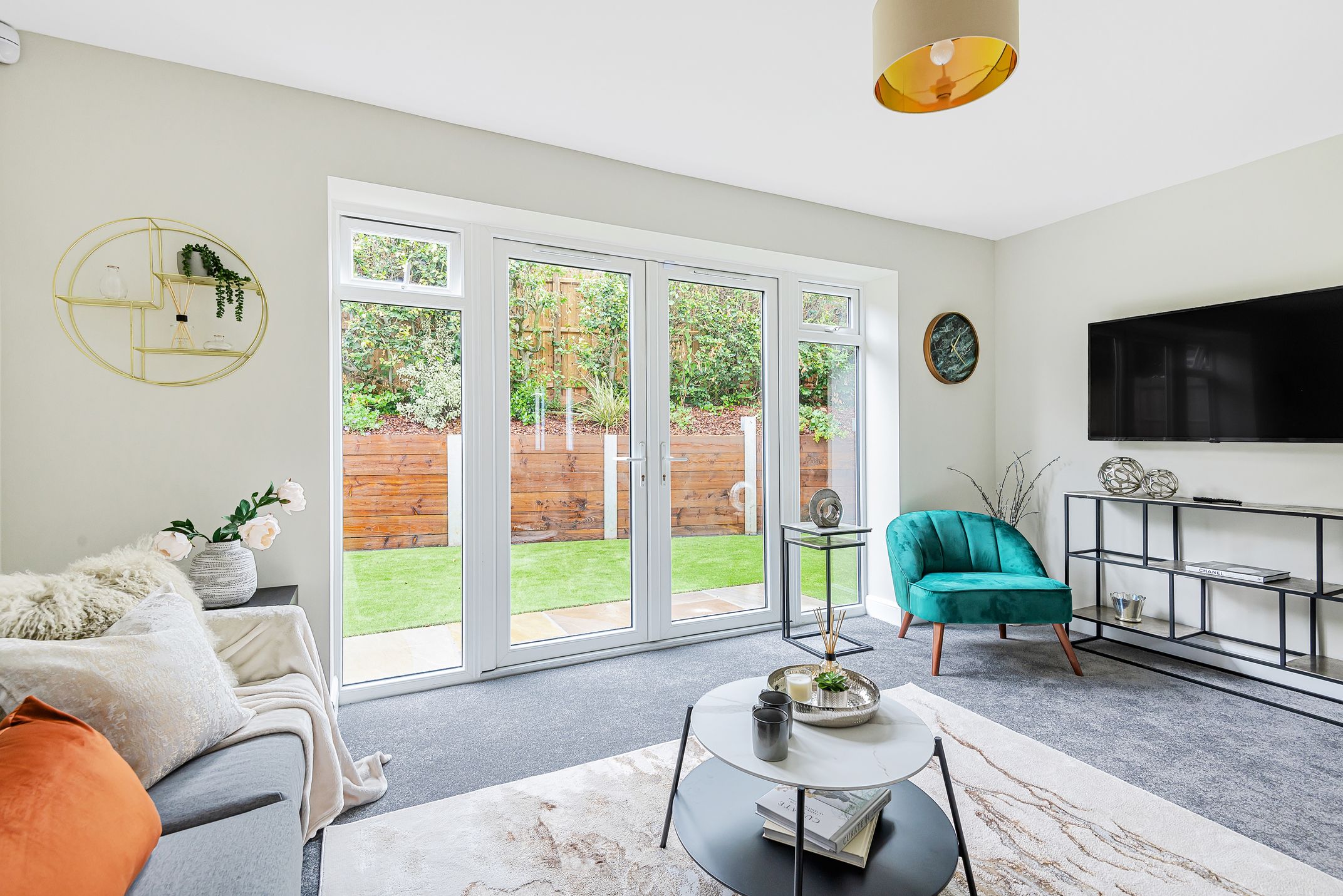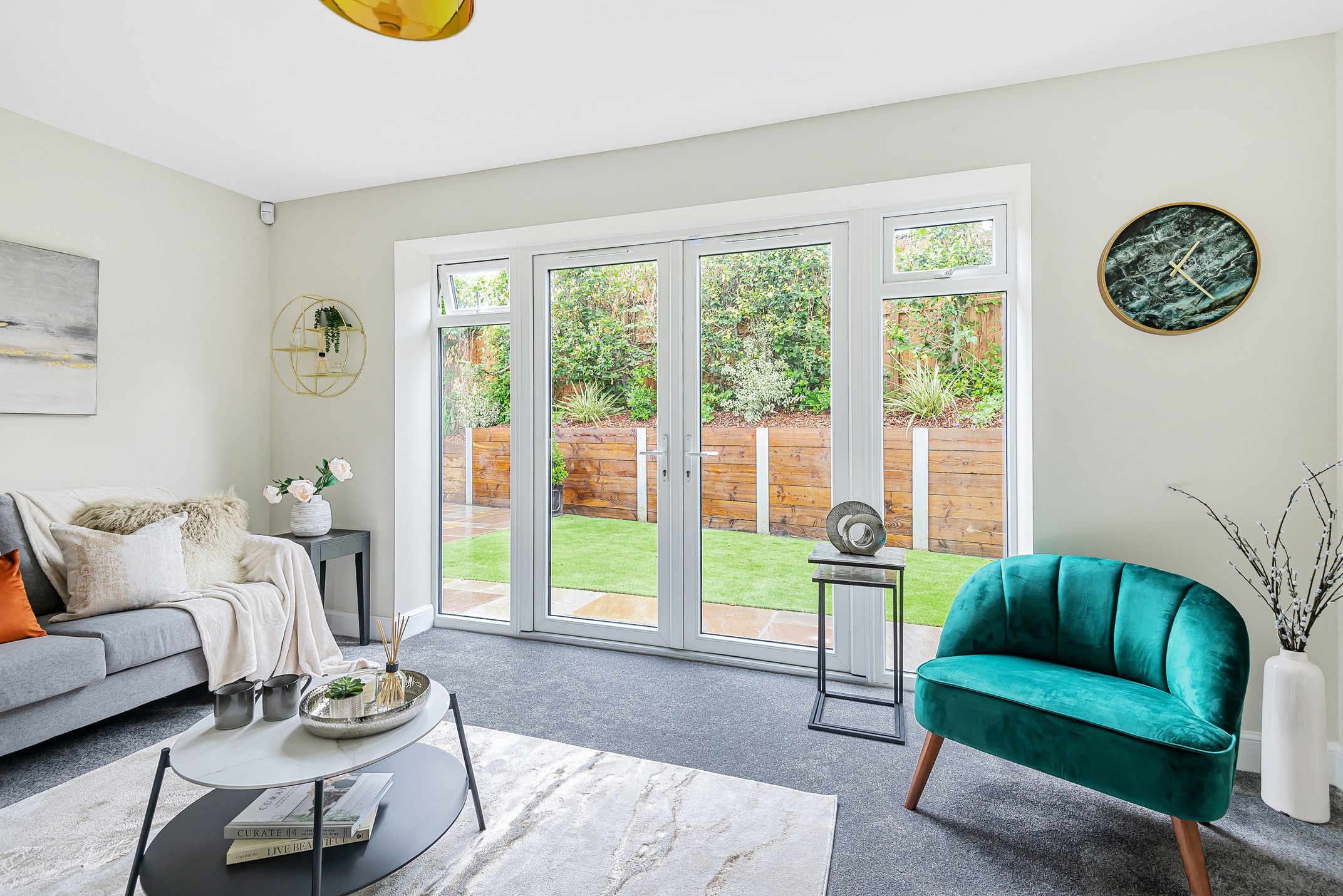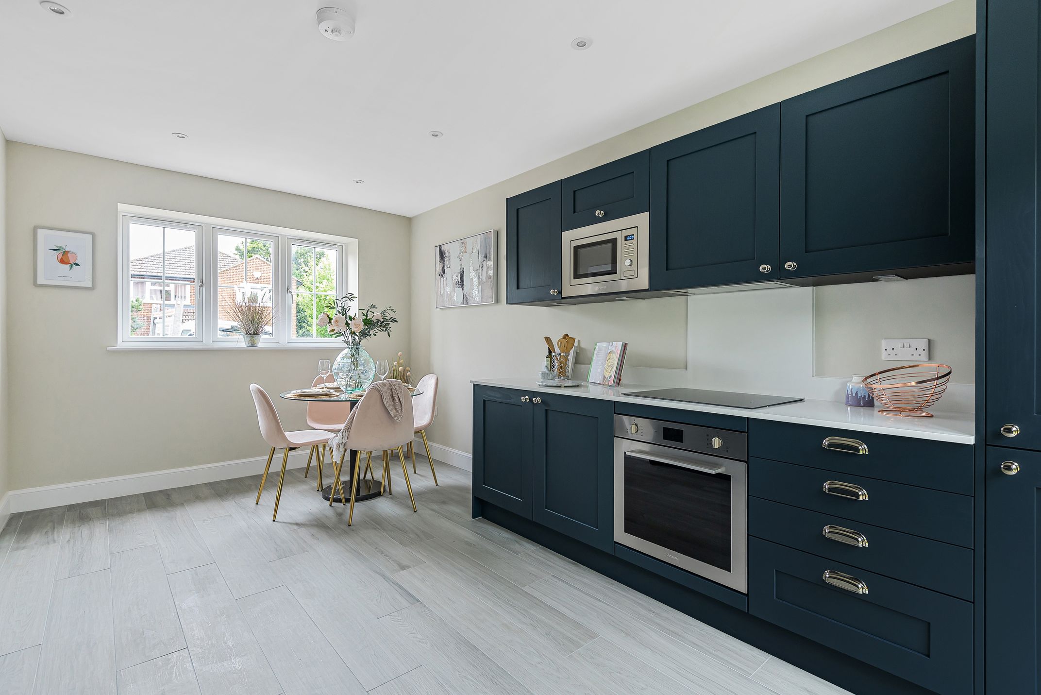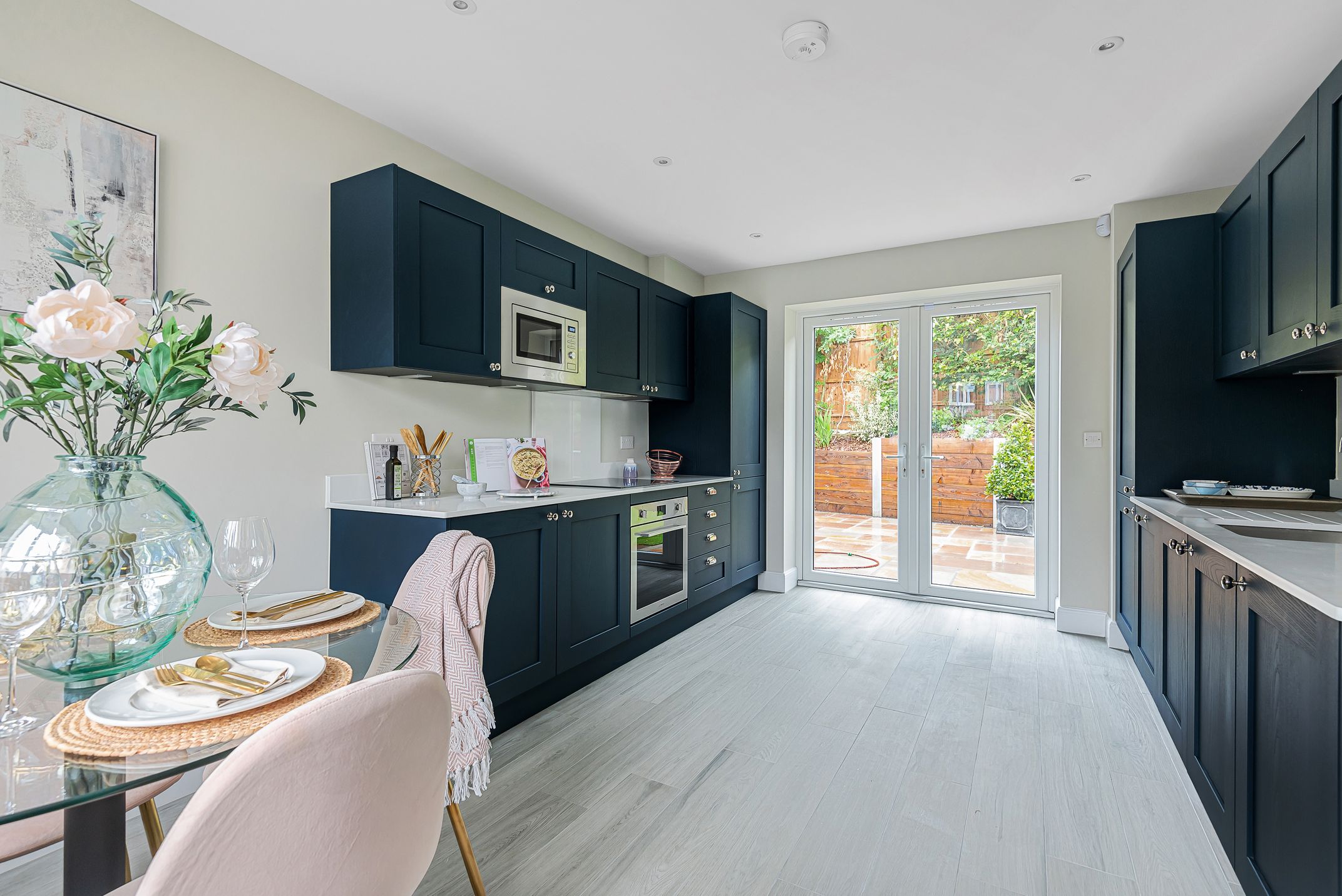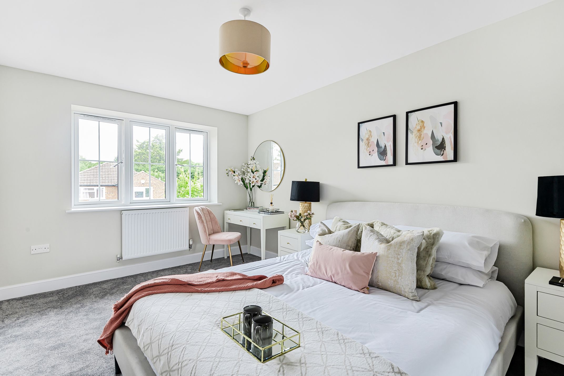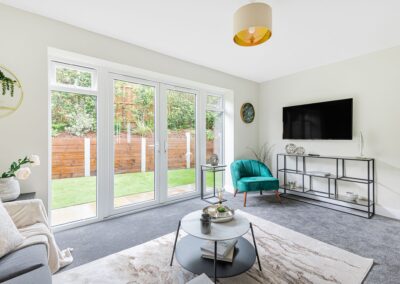 We developed a modern and elegant interiors scheme for this beautiful three bed detached property, pops of colour used throughout the upholstery, accessories and art work, in particular pairing blush pink dining chairs with the stylish navy kitchen.