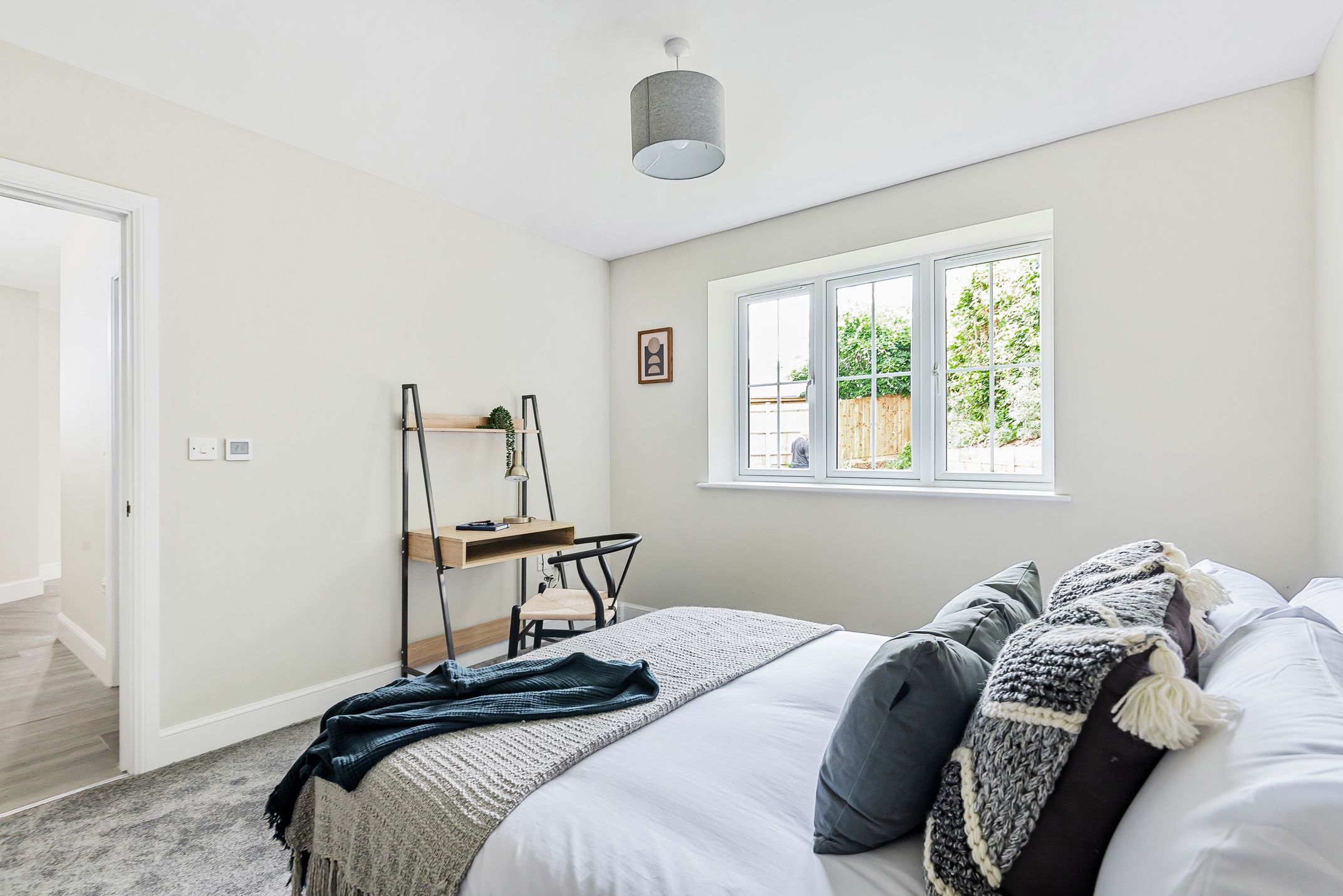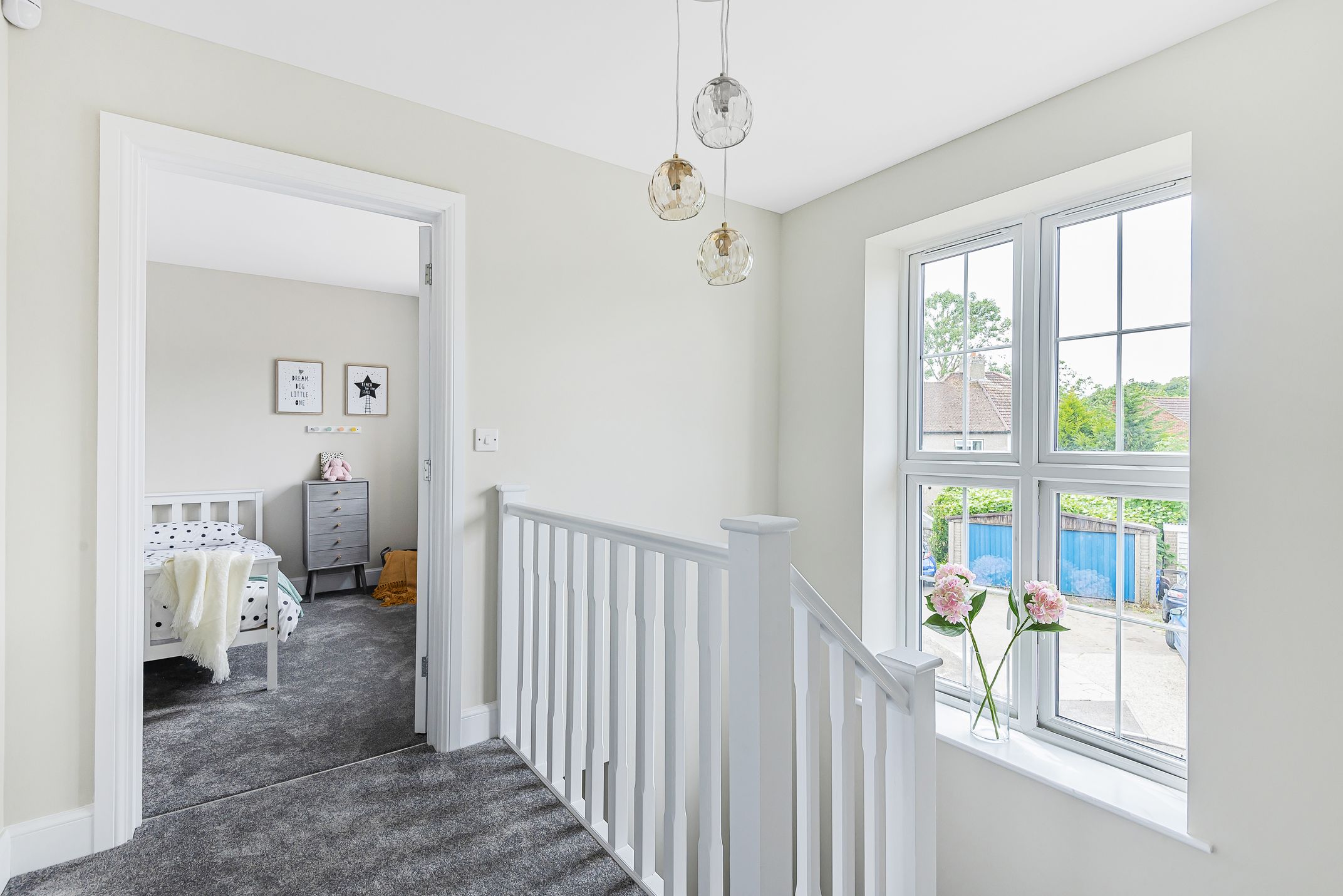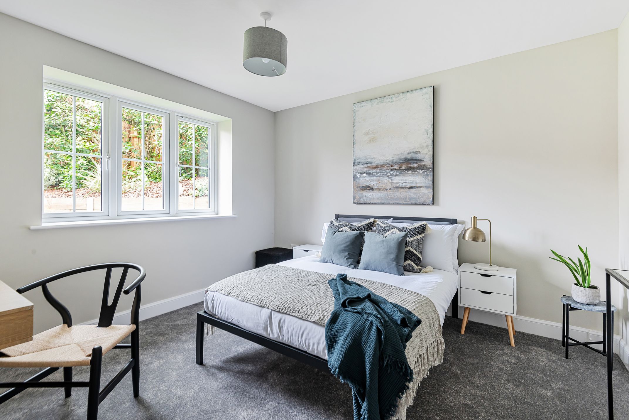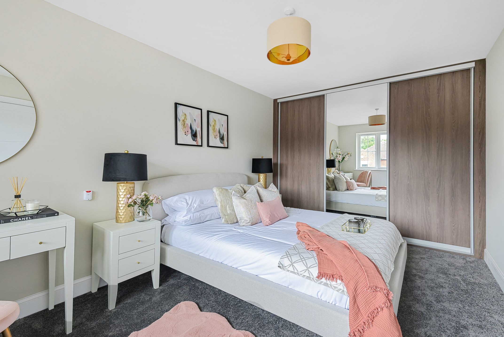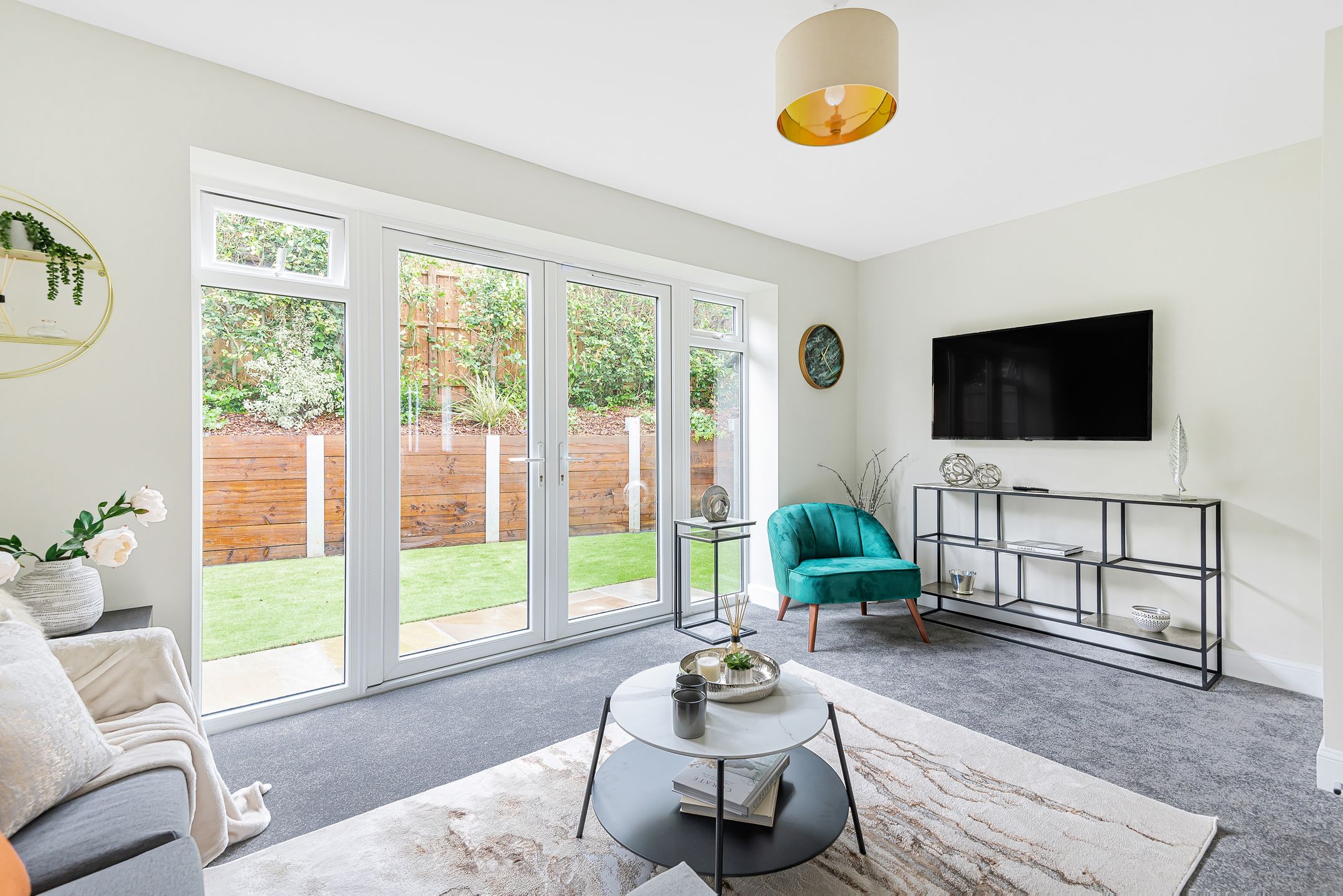We developed a modern and elegant interiors scheme for this beautiful three bed detached property, pops of colour used throughout the upholstery, accessories and art work, in particular pairing blush pink dining chairs with the stylish navy kitchen.