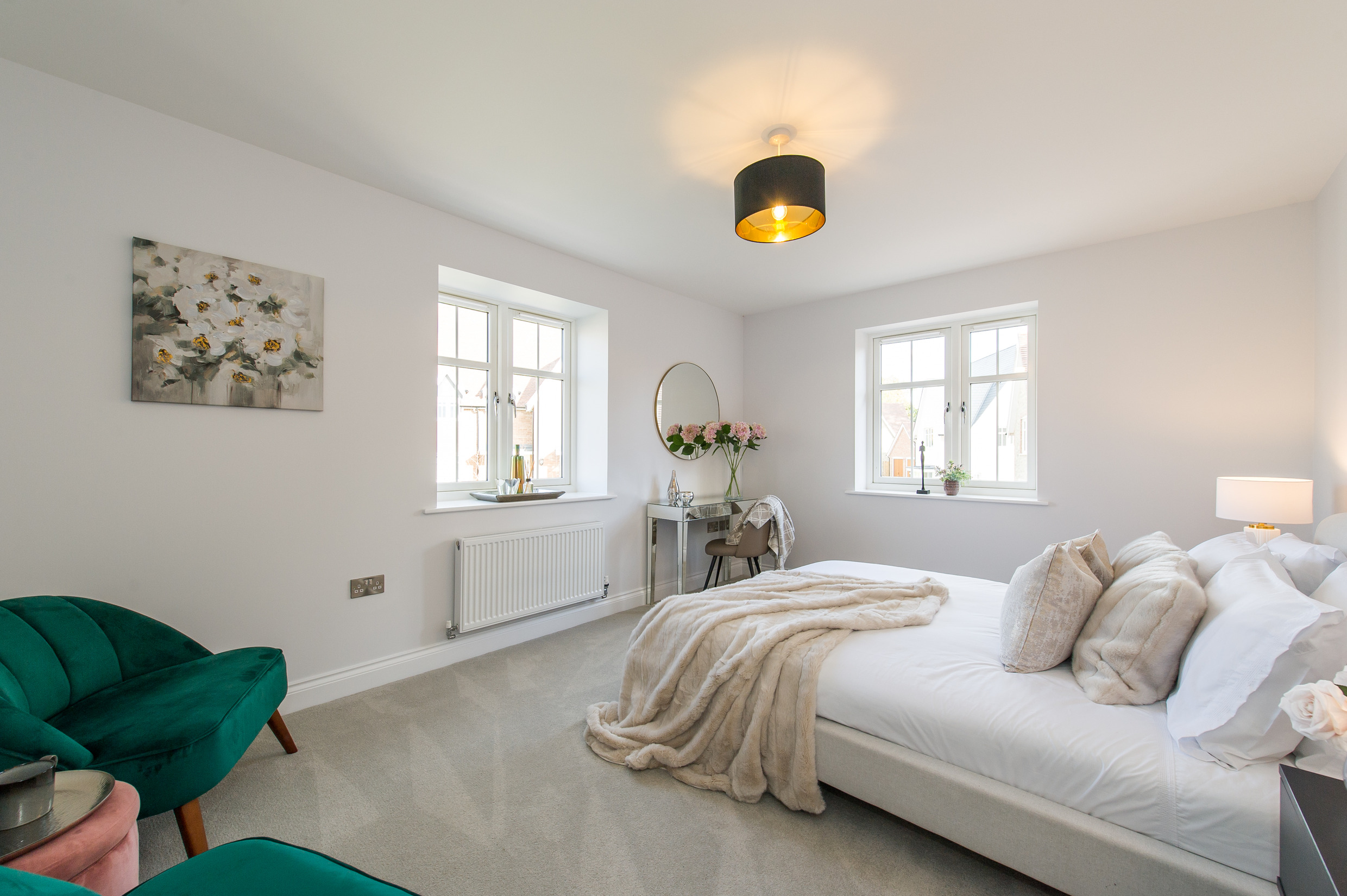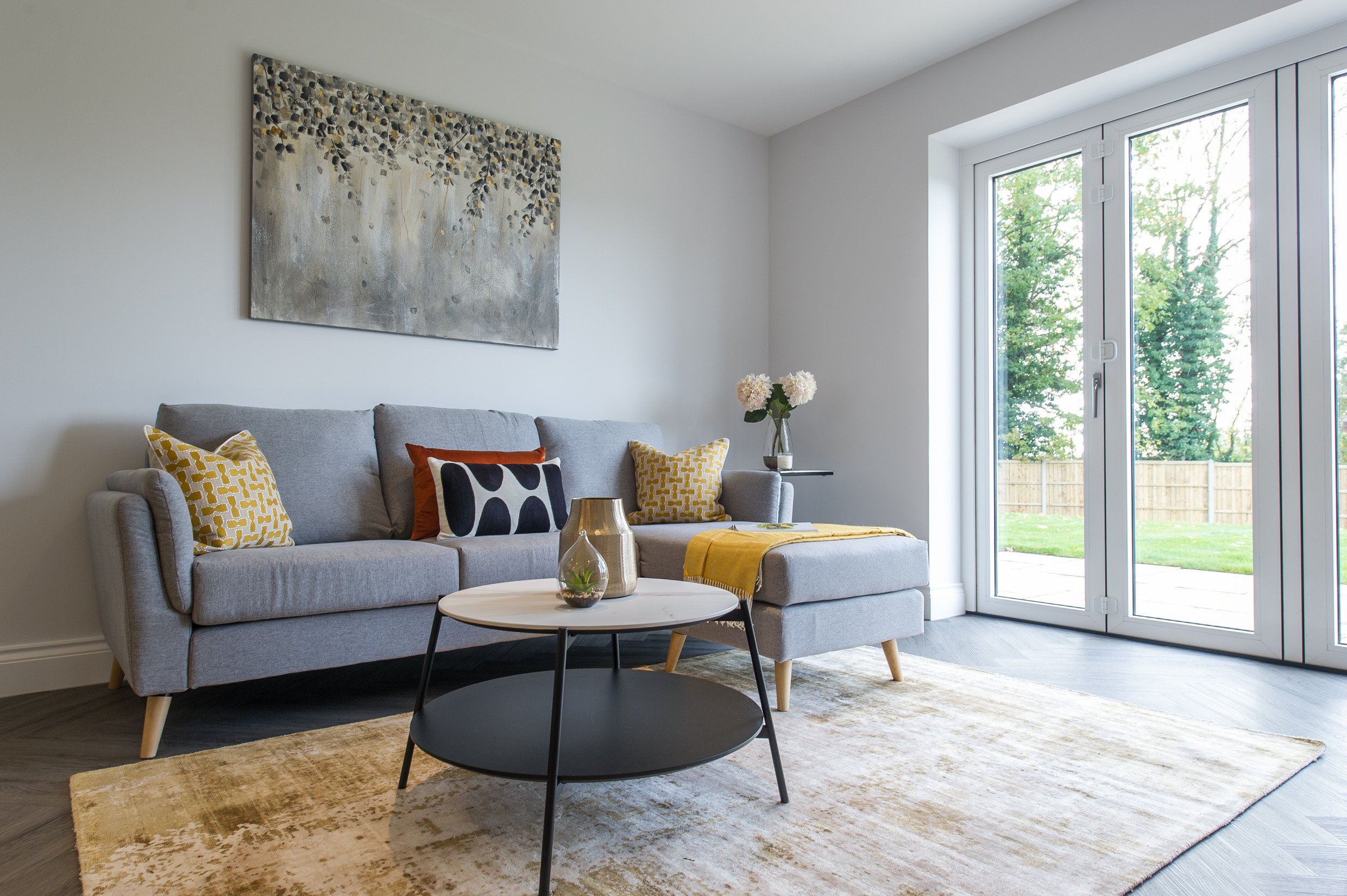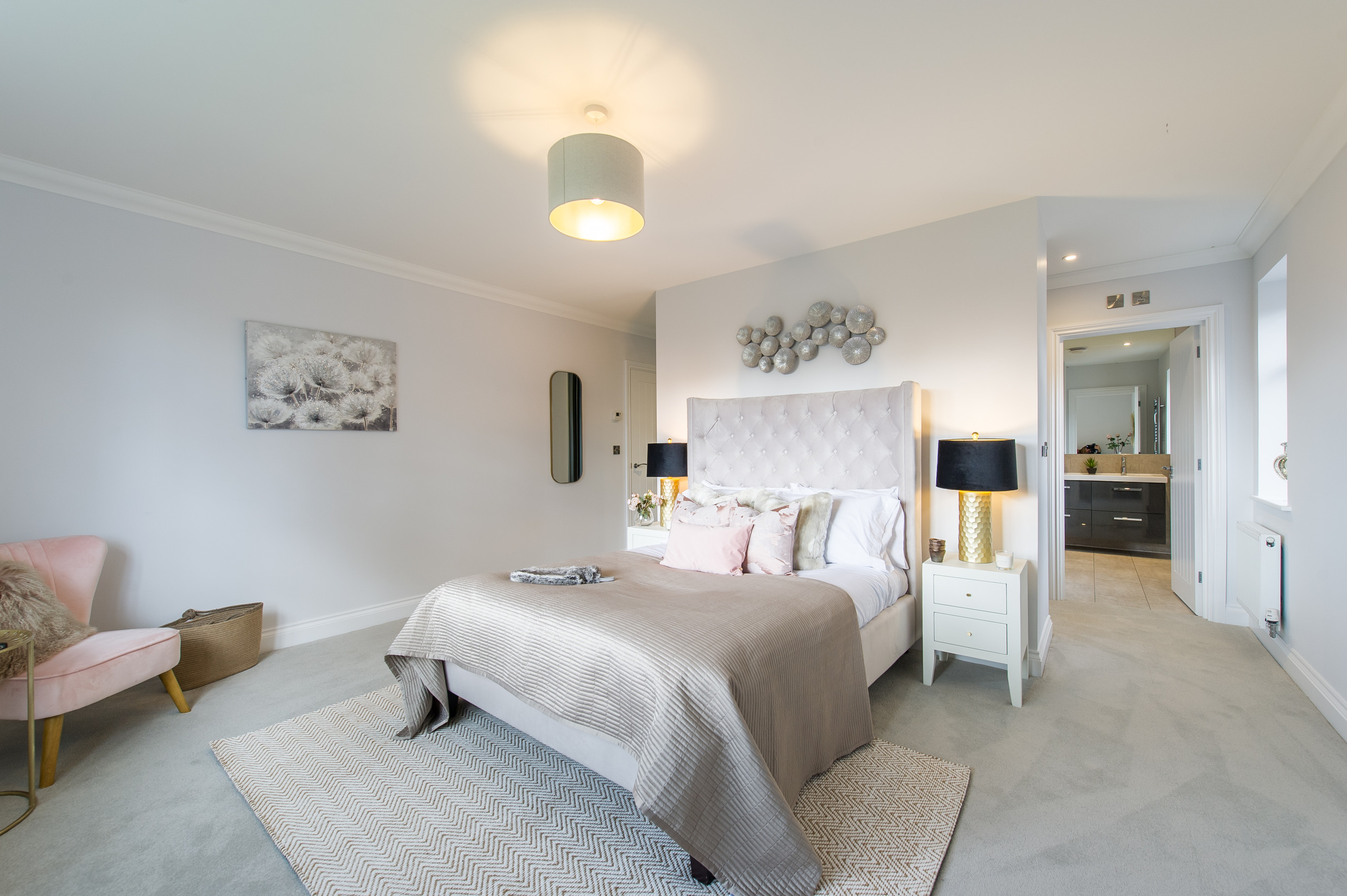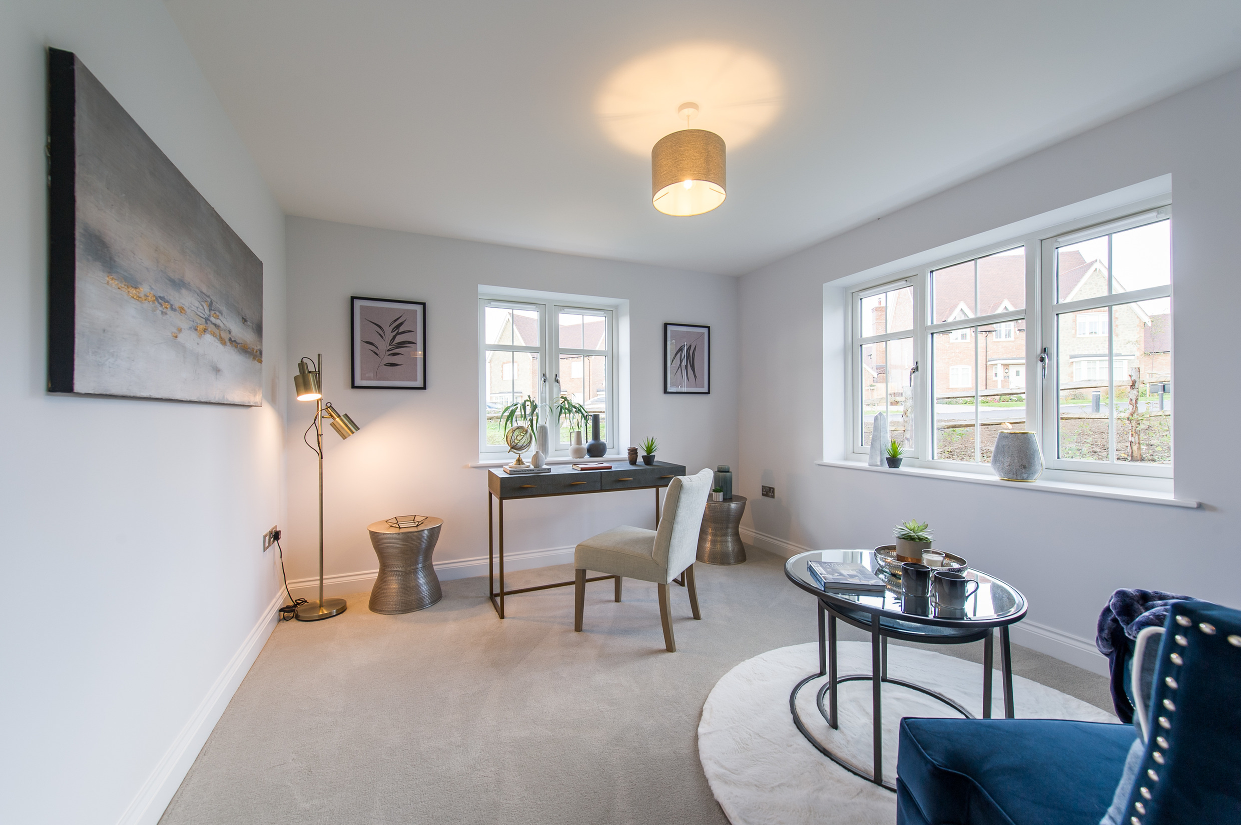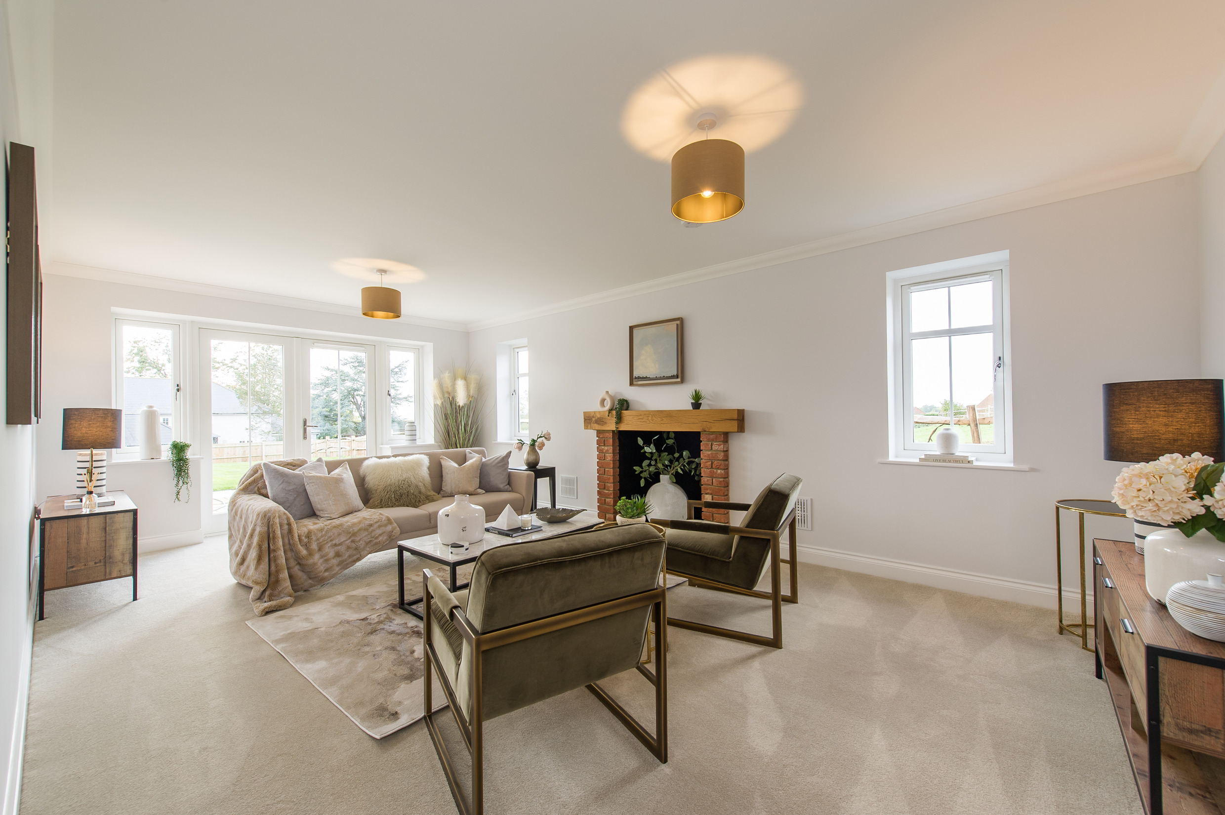To complement the beautiful design of Fernham Homes’ Elm House, we blended both classic and contemporary pieces to create a feeling of warmth, whilst also achieving a modern, fresh feel to this spacious five bed new build property. The scheme is sophisticated yet homely, appealing to a range of buyers, with pops of colour and sumptuous textures throughout. Inspired by the property’s countryside setting, we included blue, green and mustard upholstery in living spaces and bedrooms, and introduced an autumnal vibe to keep the look seasonal and considered in time for a winter launch.