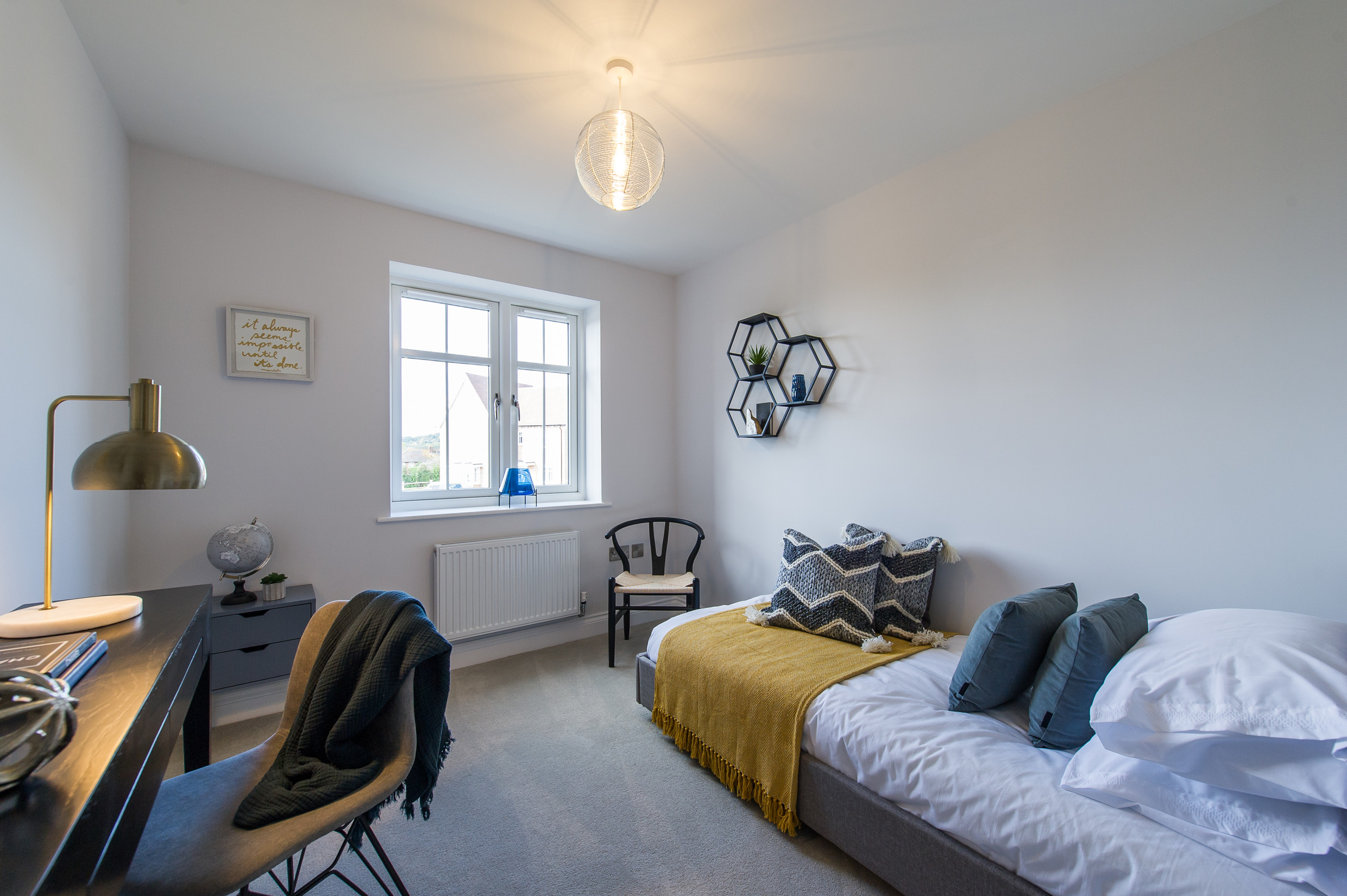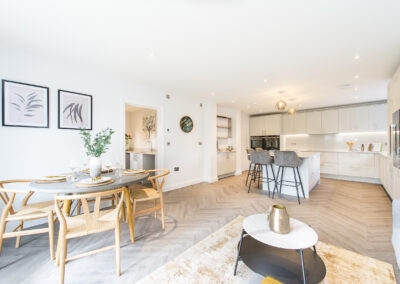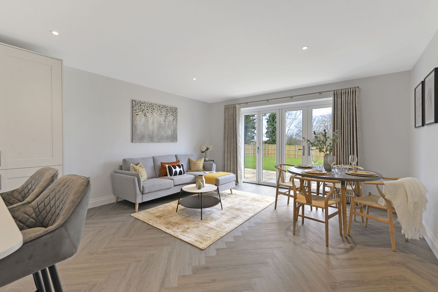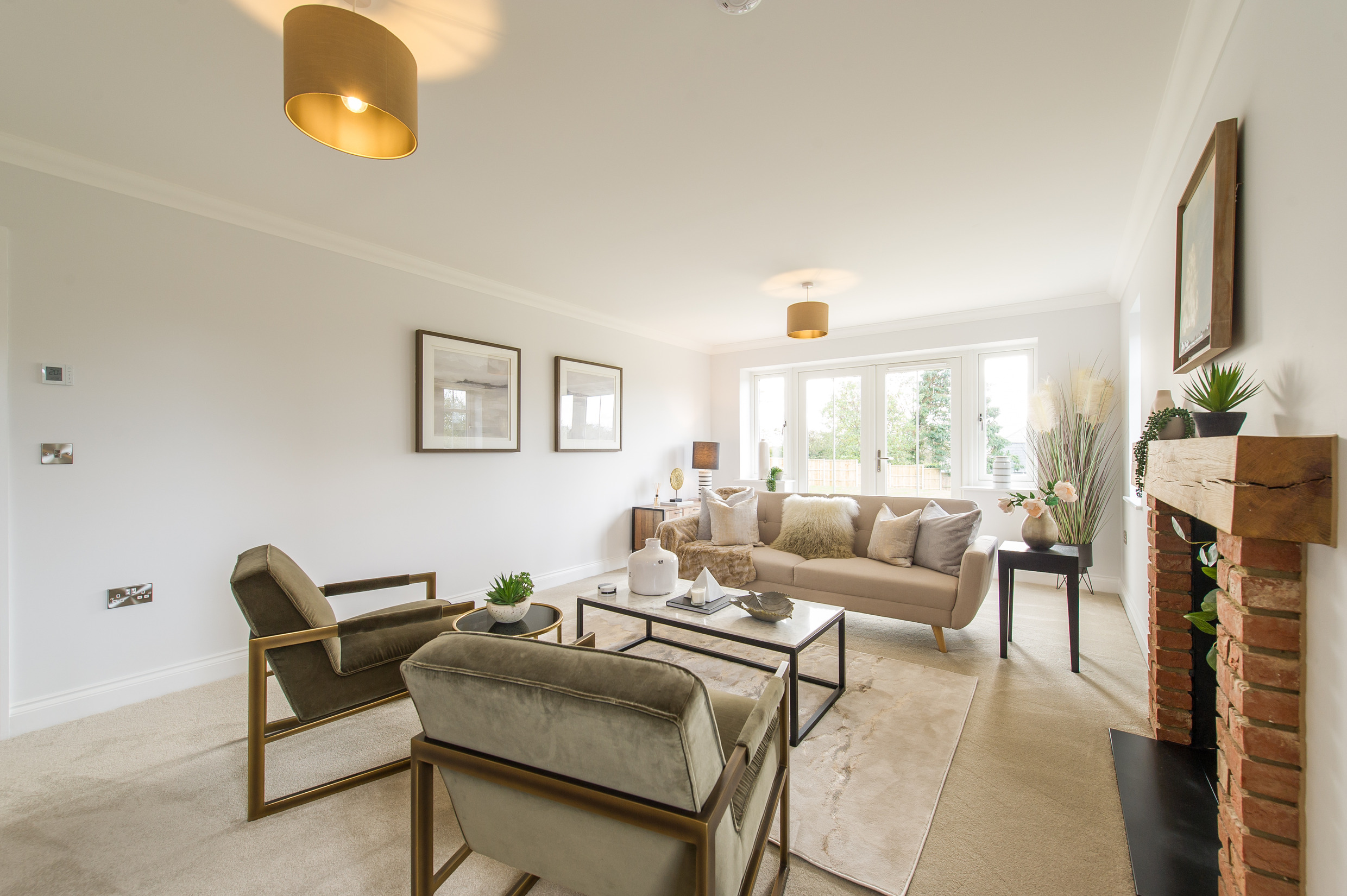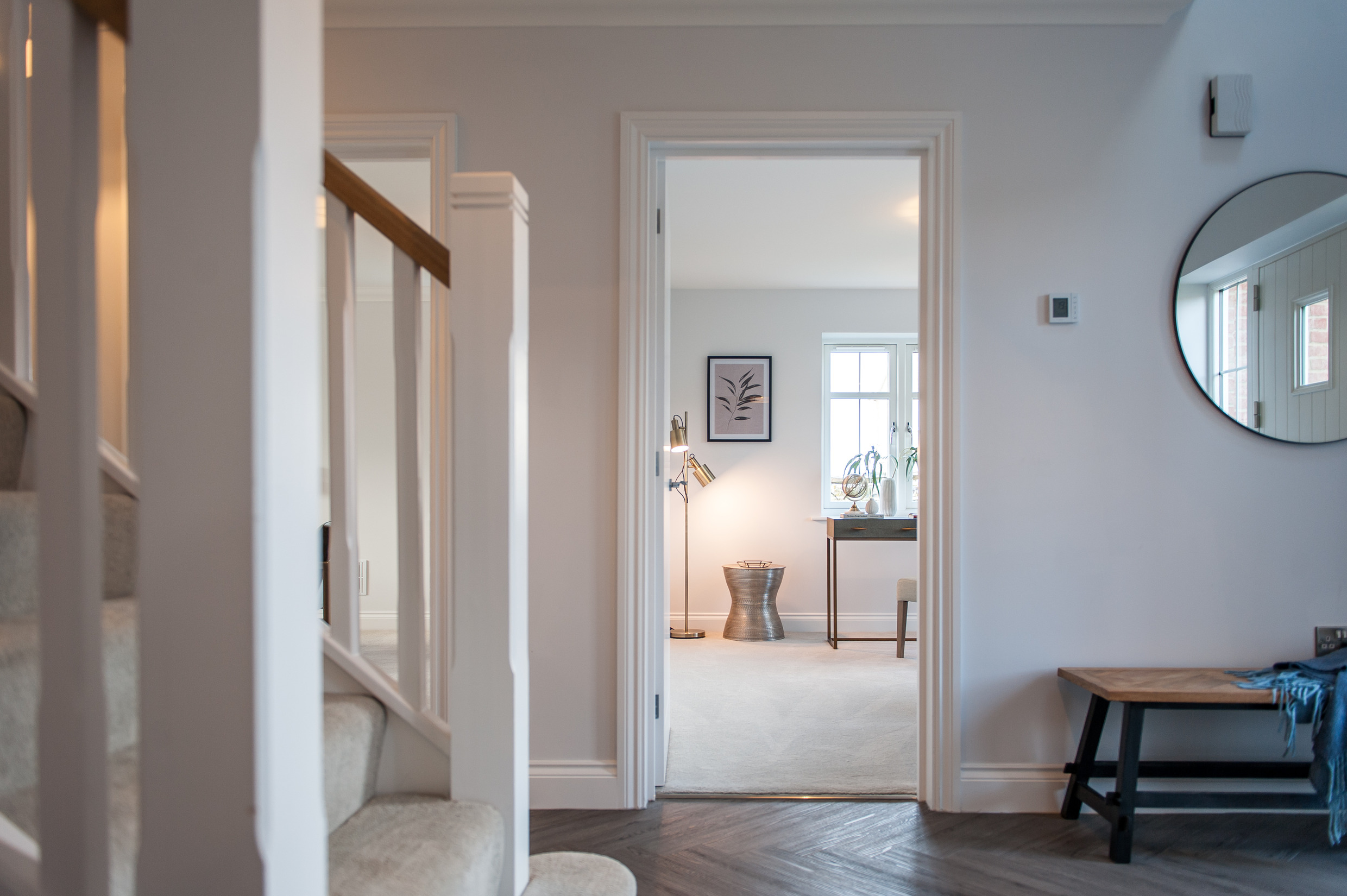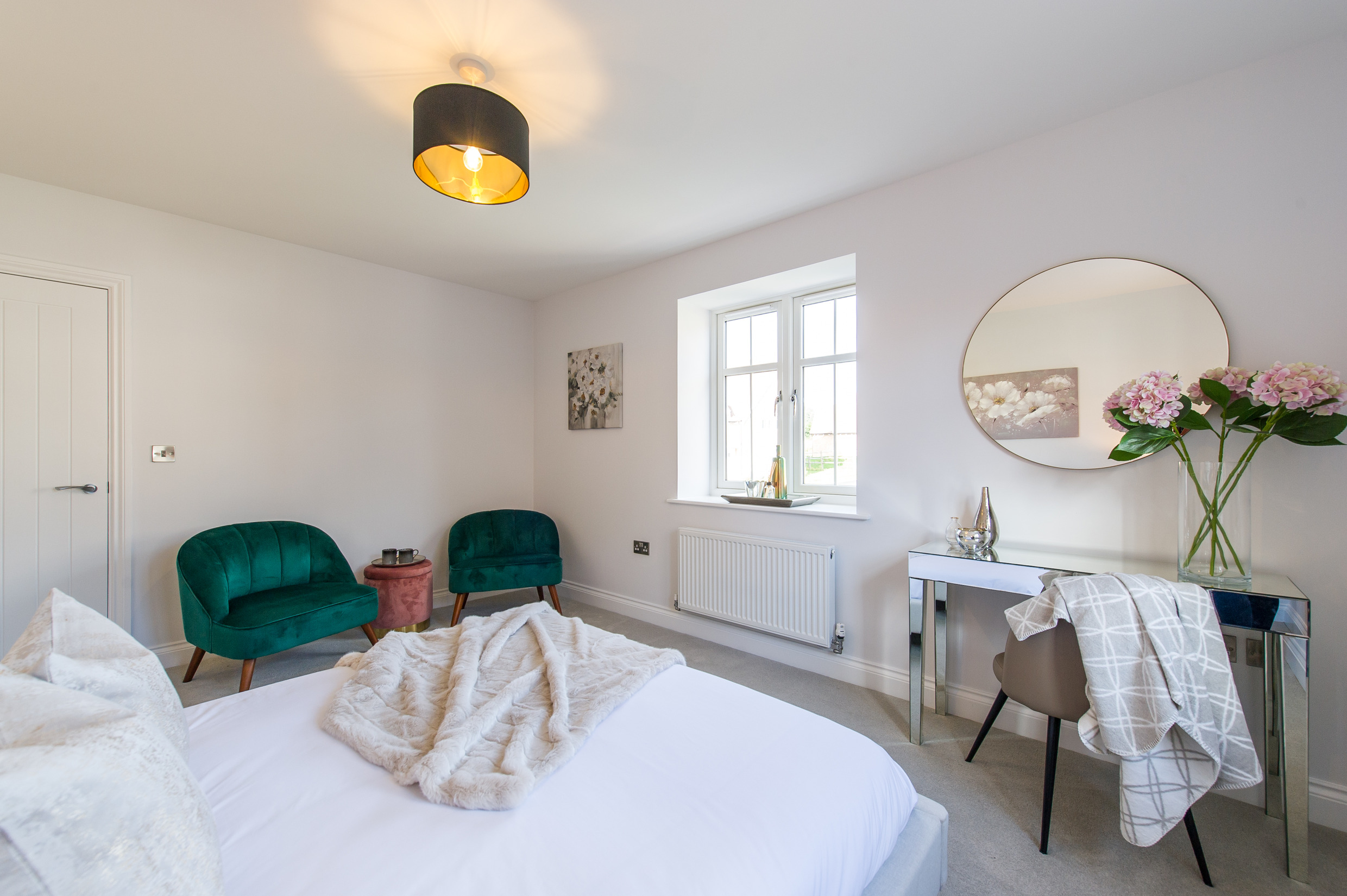 To complement the beautiful design of Fernham Homes’ Elm House, we blended both classic and contemporary pieces to create a feeling of warmth, whilst also achieving a modern, fresh feel to this spacious five bed new build property. The scheme is sophisticated yet homely, appealing to a range of buyers, with pops of colour and sumptuous textures throughout. Inspired by the property’s countryside setting, we included blue, green and mustard upholstery in living spaces and bedrooms, and introduced an autumnal vibe to keep the look seasonal and considered in time for a winter launch.