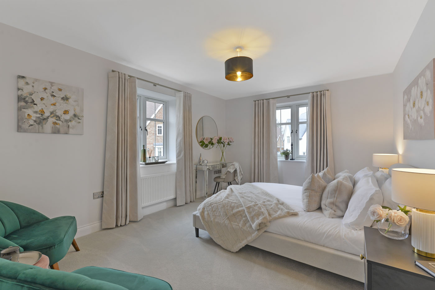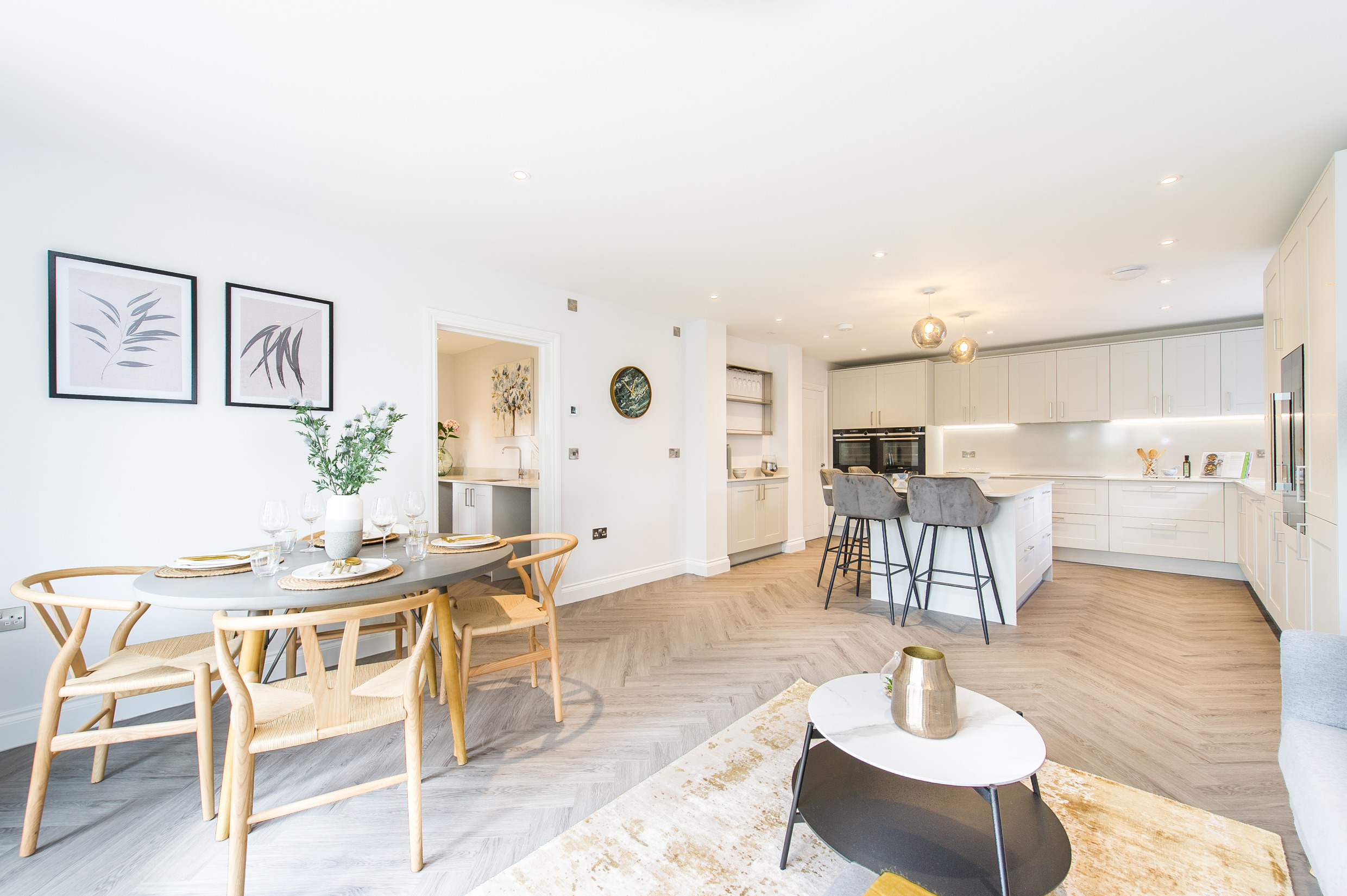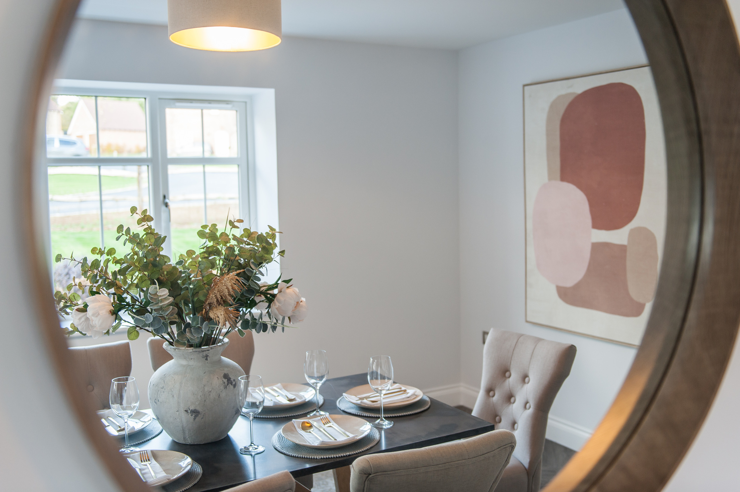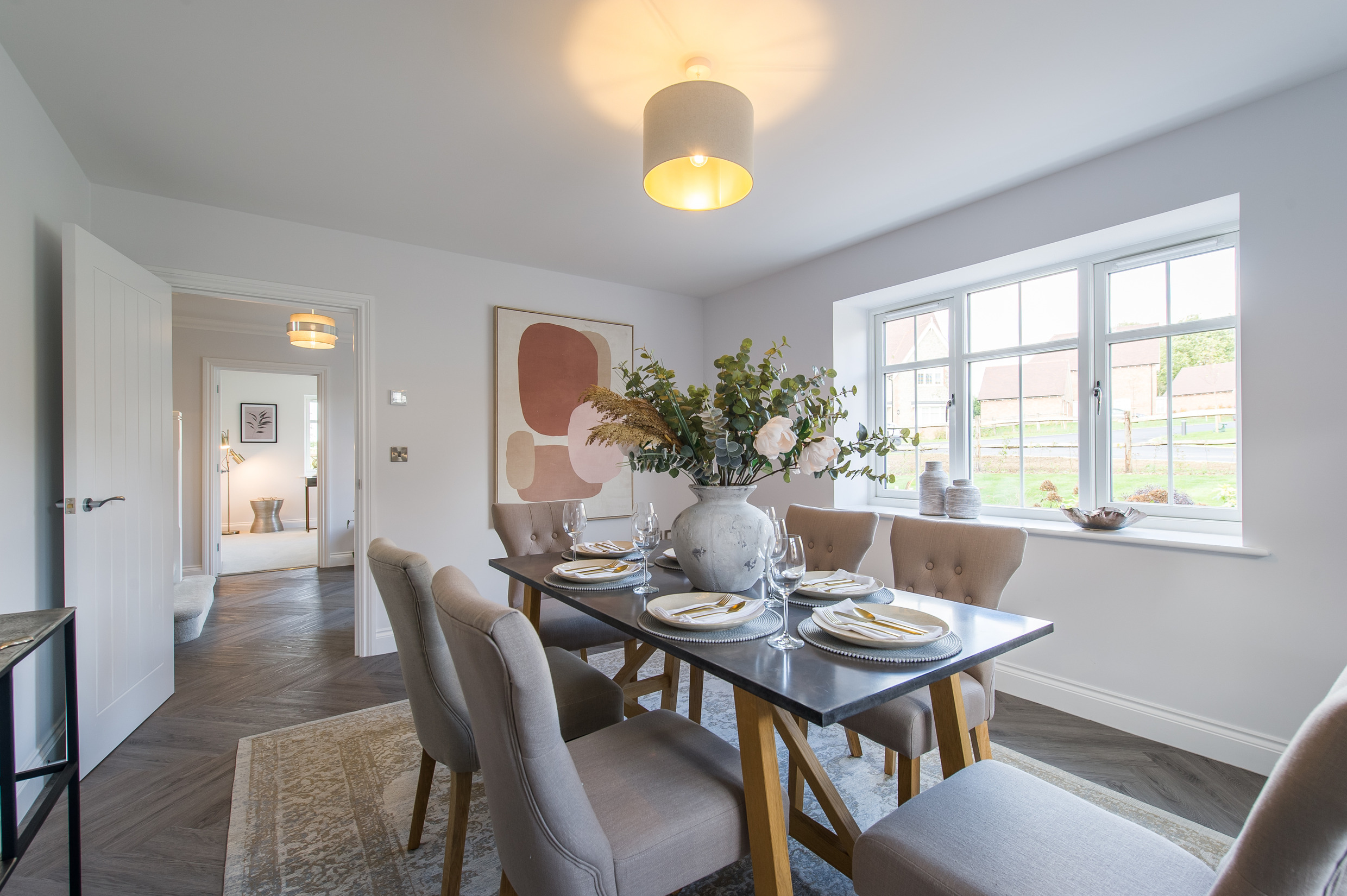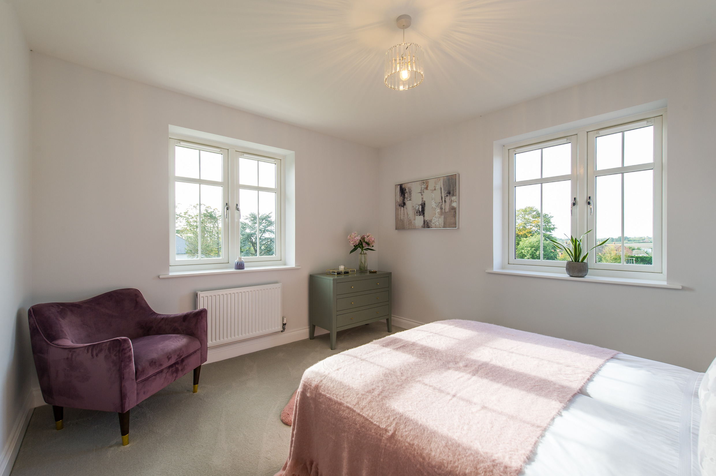 To complement the beautiful design of Fernham Homes’ Elm House, we blended both classic and contemporary pieces to create a feeling of warmth, whilst also achieving a modern, fresh feel to this spacious five bed new build property. The scheme is sophisticated yet homely, appealing to a range of buyers, with pops of colour and sumptuous textures throughout. Inspired by the property’s countryside setting, we included blue, green and mustard upholstery in living spaces and bedrooms, and introduced an autumnal vibe to keep the look seasonal and considered in time for a winter launch.