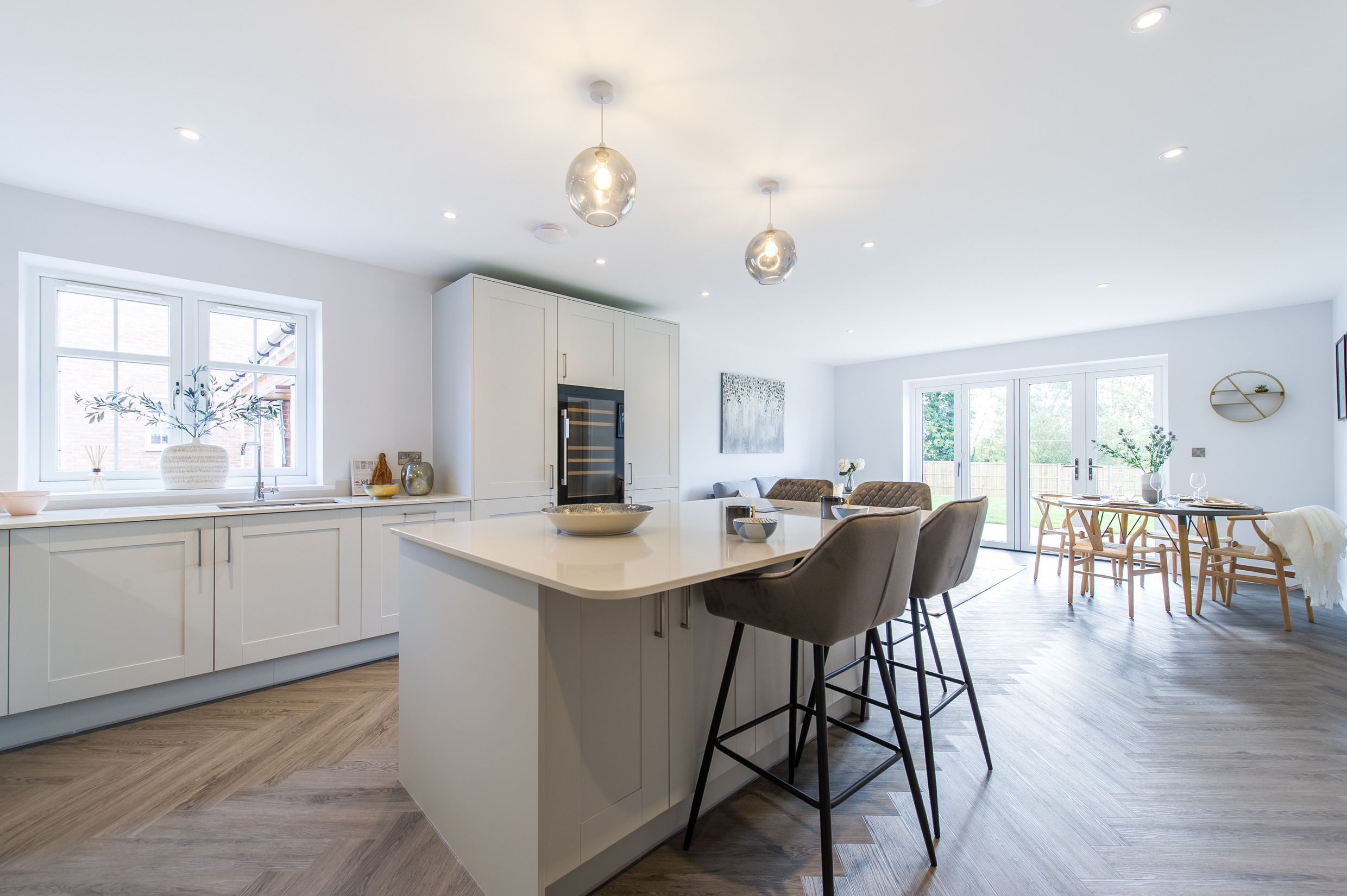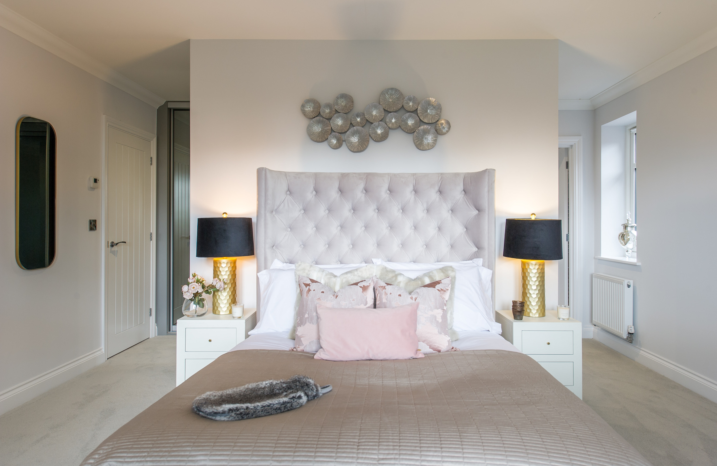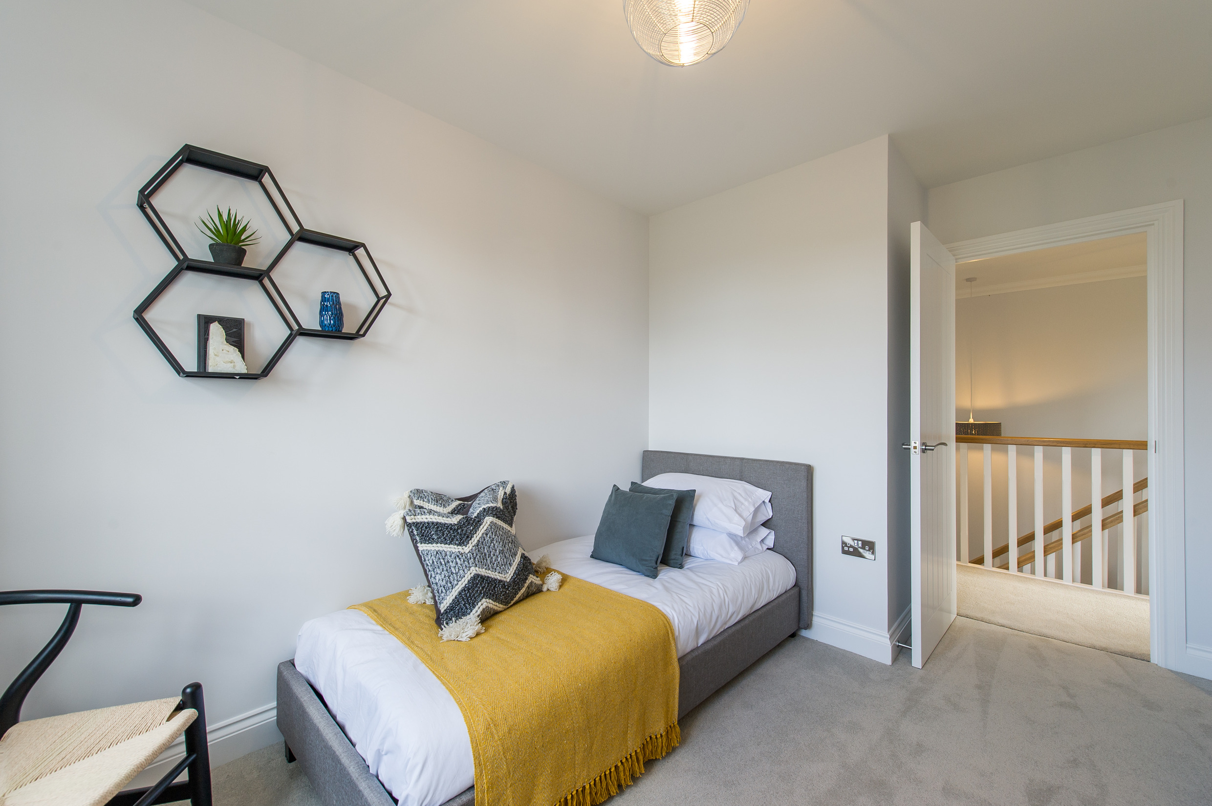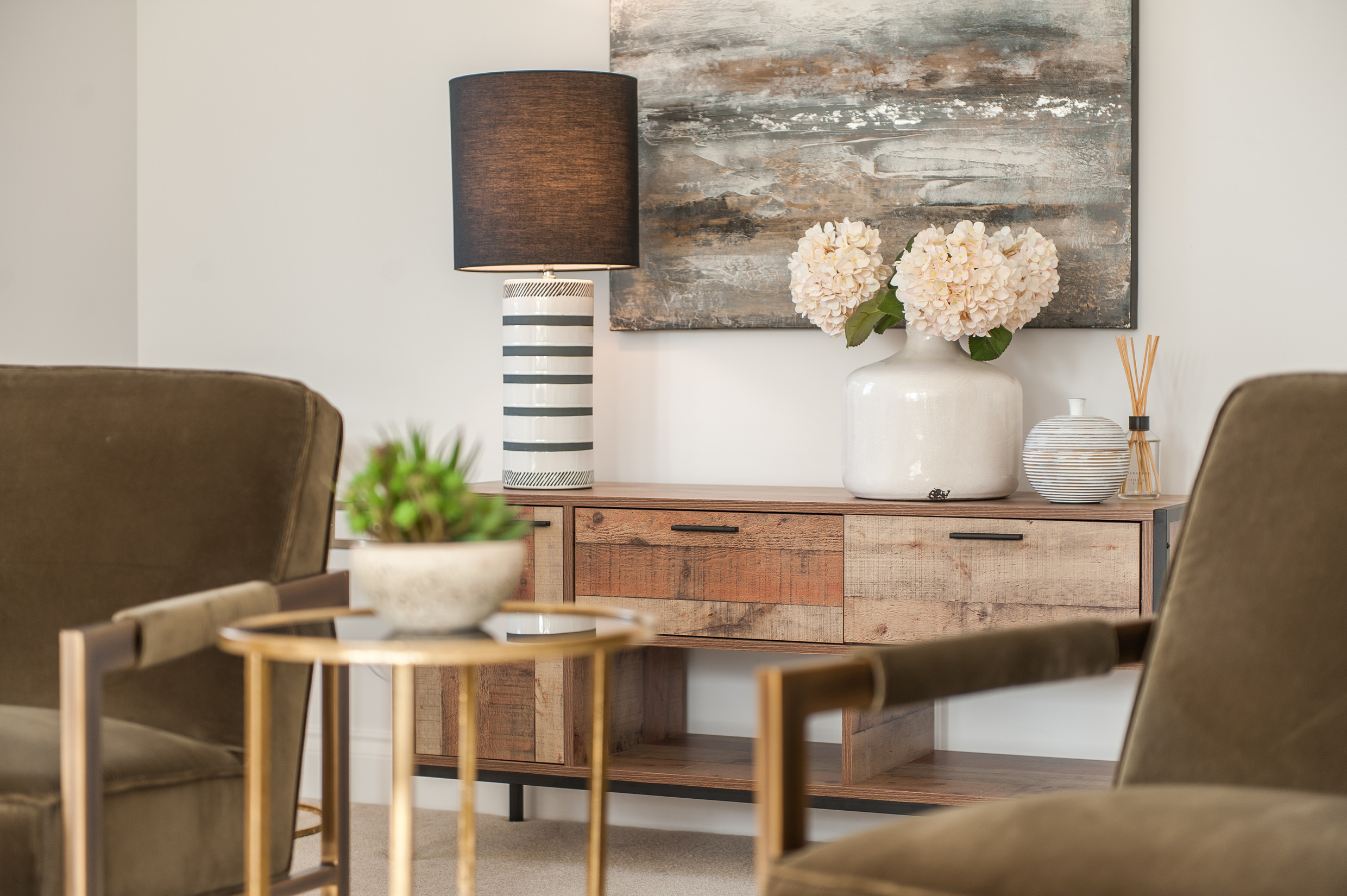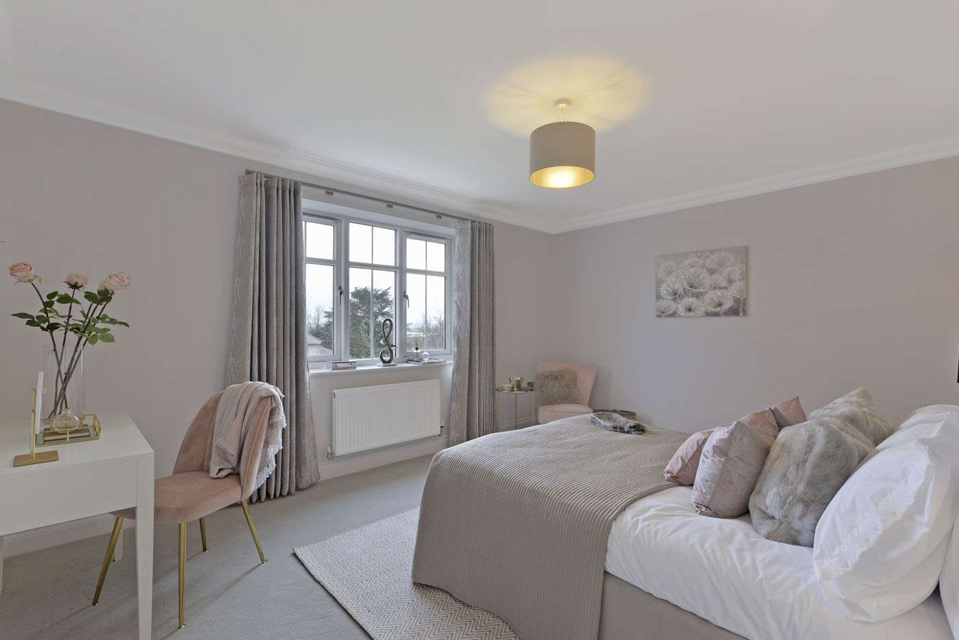 To complement the beautiful design of Fernham Homes’ Elm House, we blended both classic and contemporary pieces to create a feeling of warmth, whilst also achieving a modern, fresh feel to this spacious five bed new build property. The scheme is sophisticated yet homely, appealing to a range of buyers, with pops of colour and sumptuous textures throughout. Inspired by the property’s countryside setting, we included blue, green and mustard upholstery in living spaces and bedrooms, and introduced an autumnal vibe to keep the look seasonal and considered in time for a winter launch.
