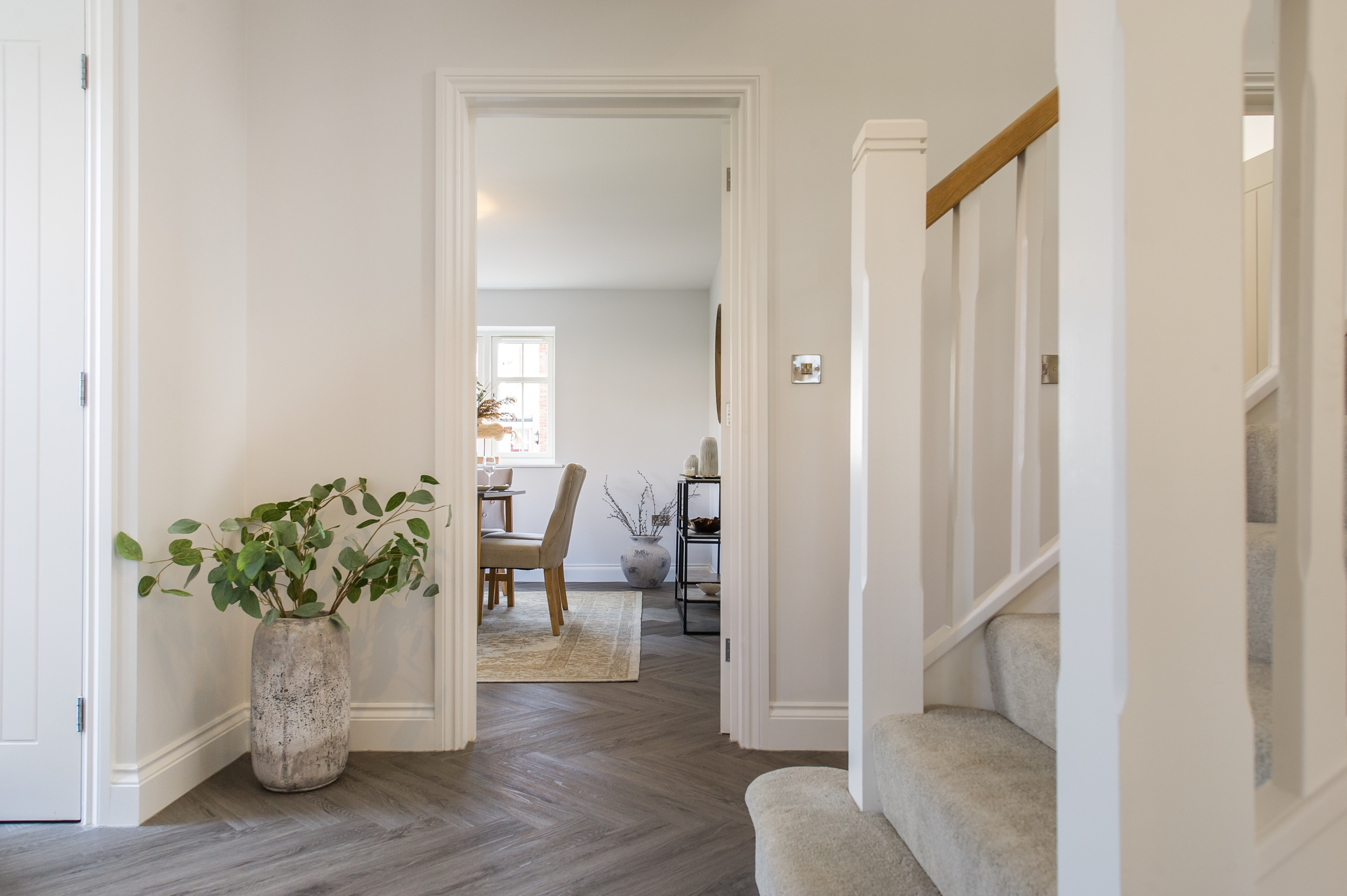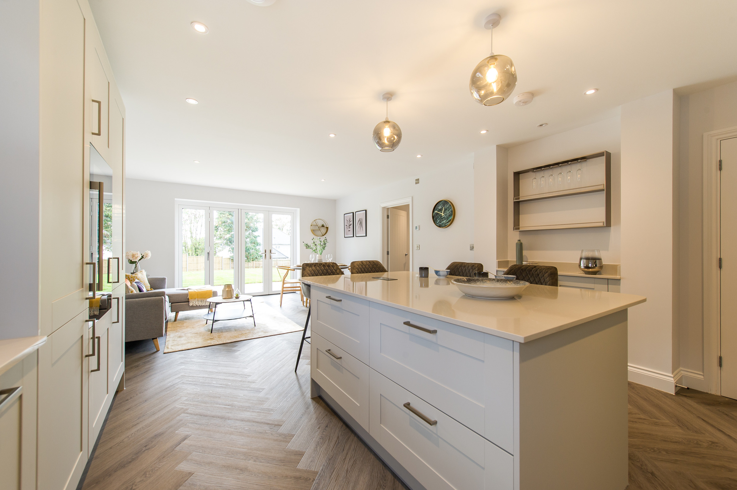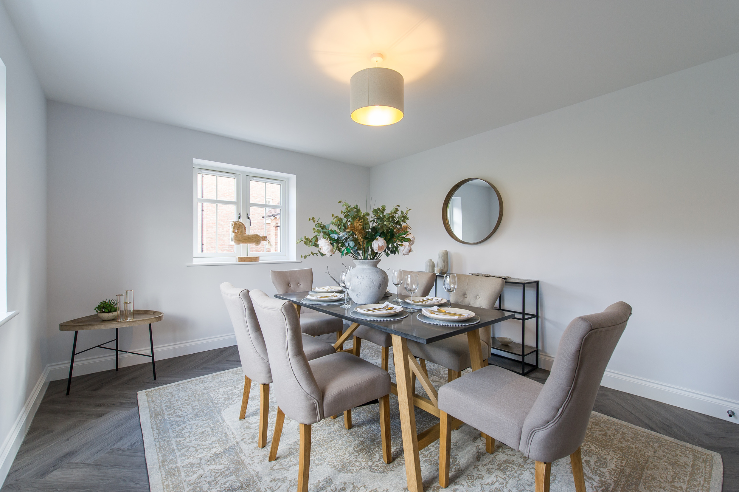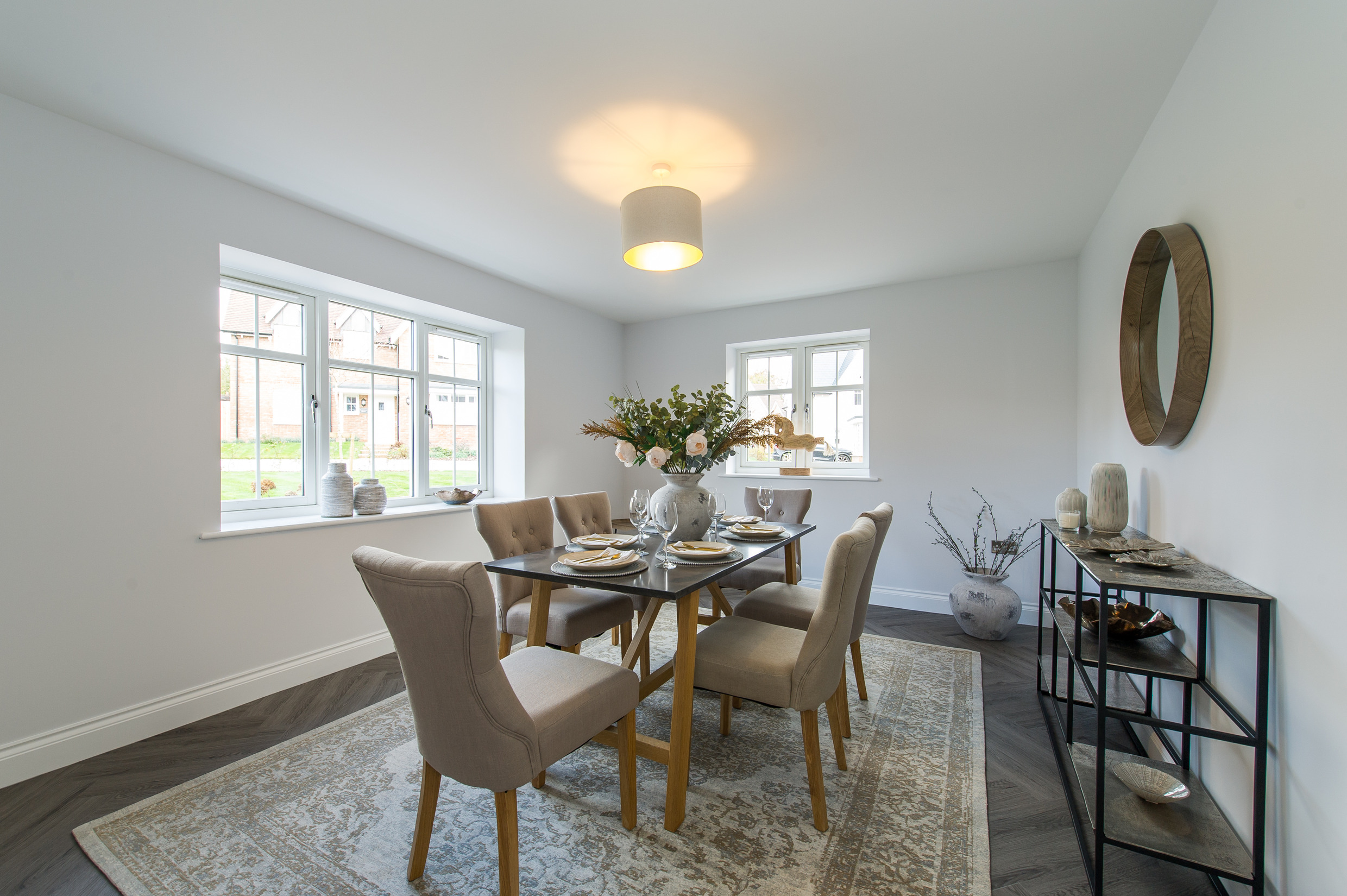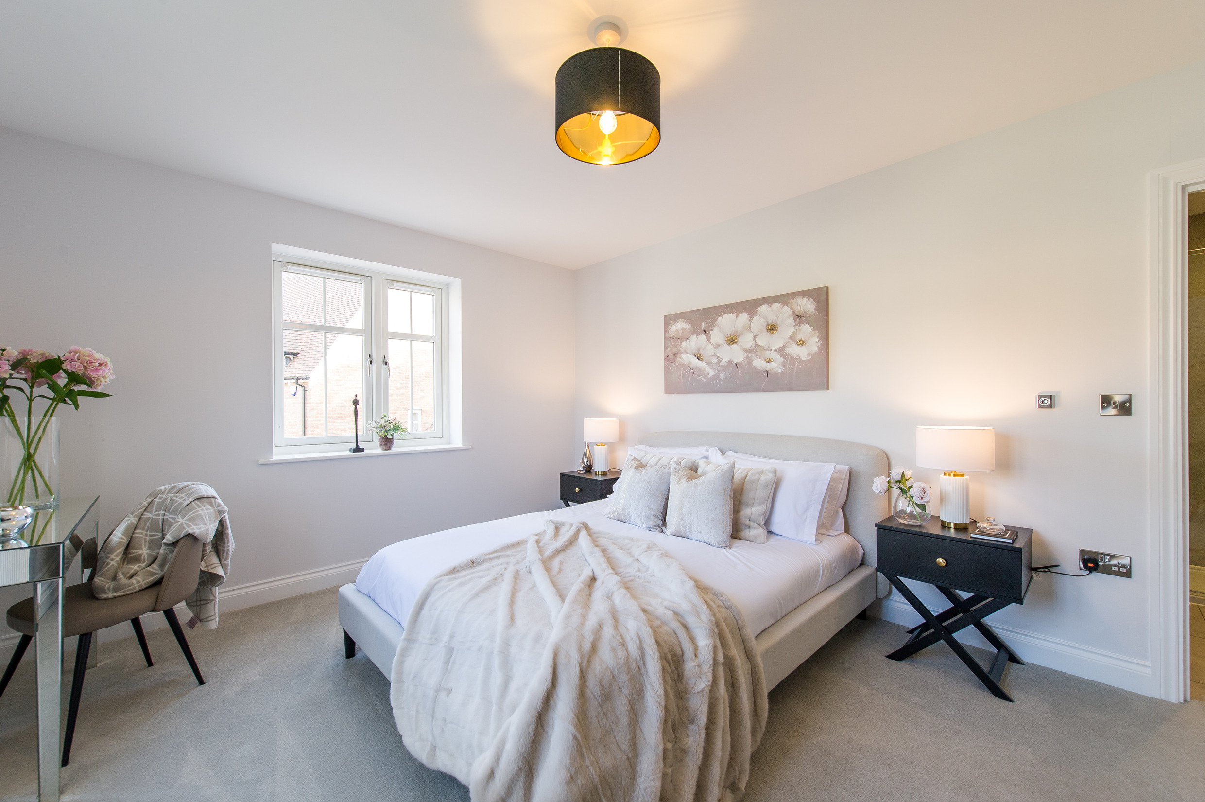 To complement the beautiful design of Fernham Homes’ Elm House, we blended both classic and contemporary pieces to create a feeling of warmth, whilst also achieving a modern, fresh feel to this spacious five bed new build property. The scheme is sophisticated yet homely, appealing to a range of buyers, with pops of colour and sumptuous textures throughout. Inspired by the property’s countryside setting, we included blue, green and mustard upholstery in living spaces and bedrooms, and introduced an autumnal vibe to keep the look seasonal and considered in time for a winter launch.