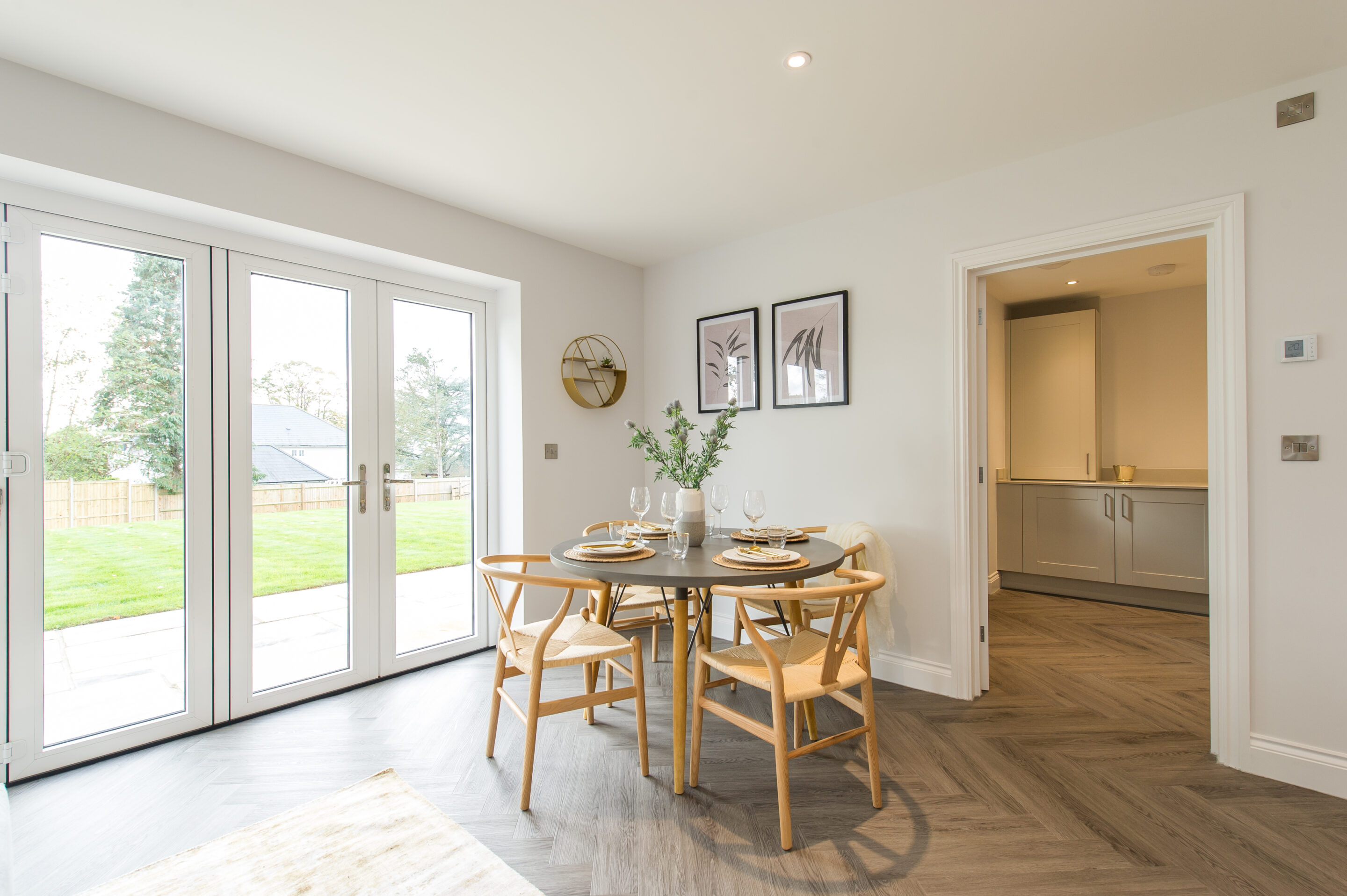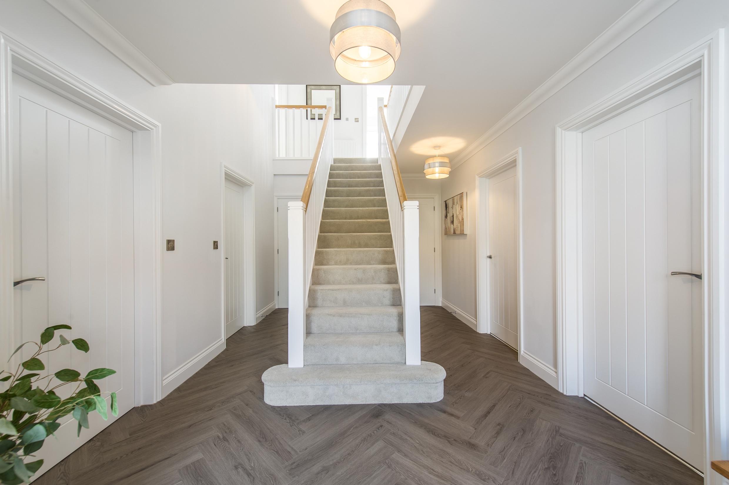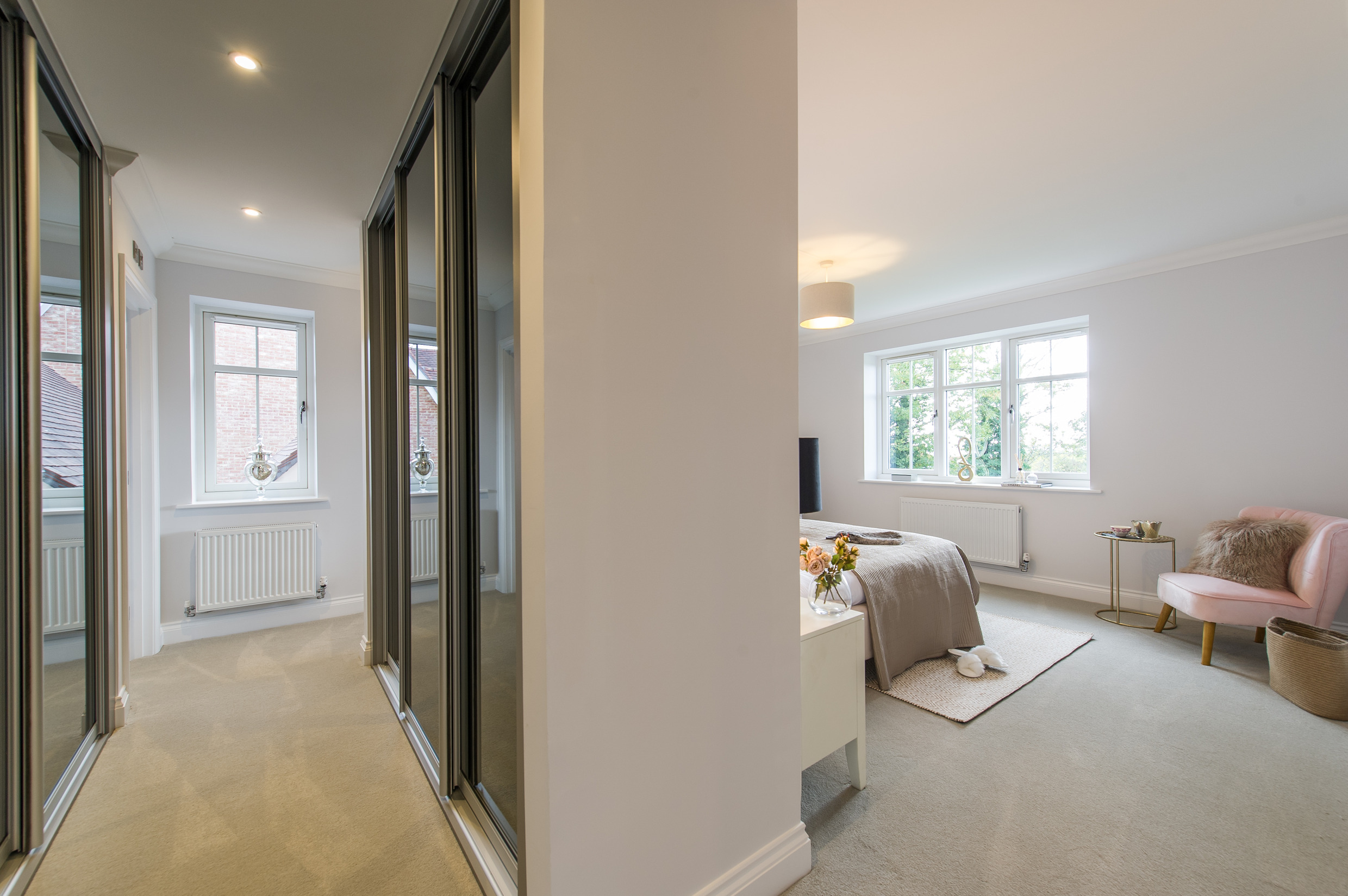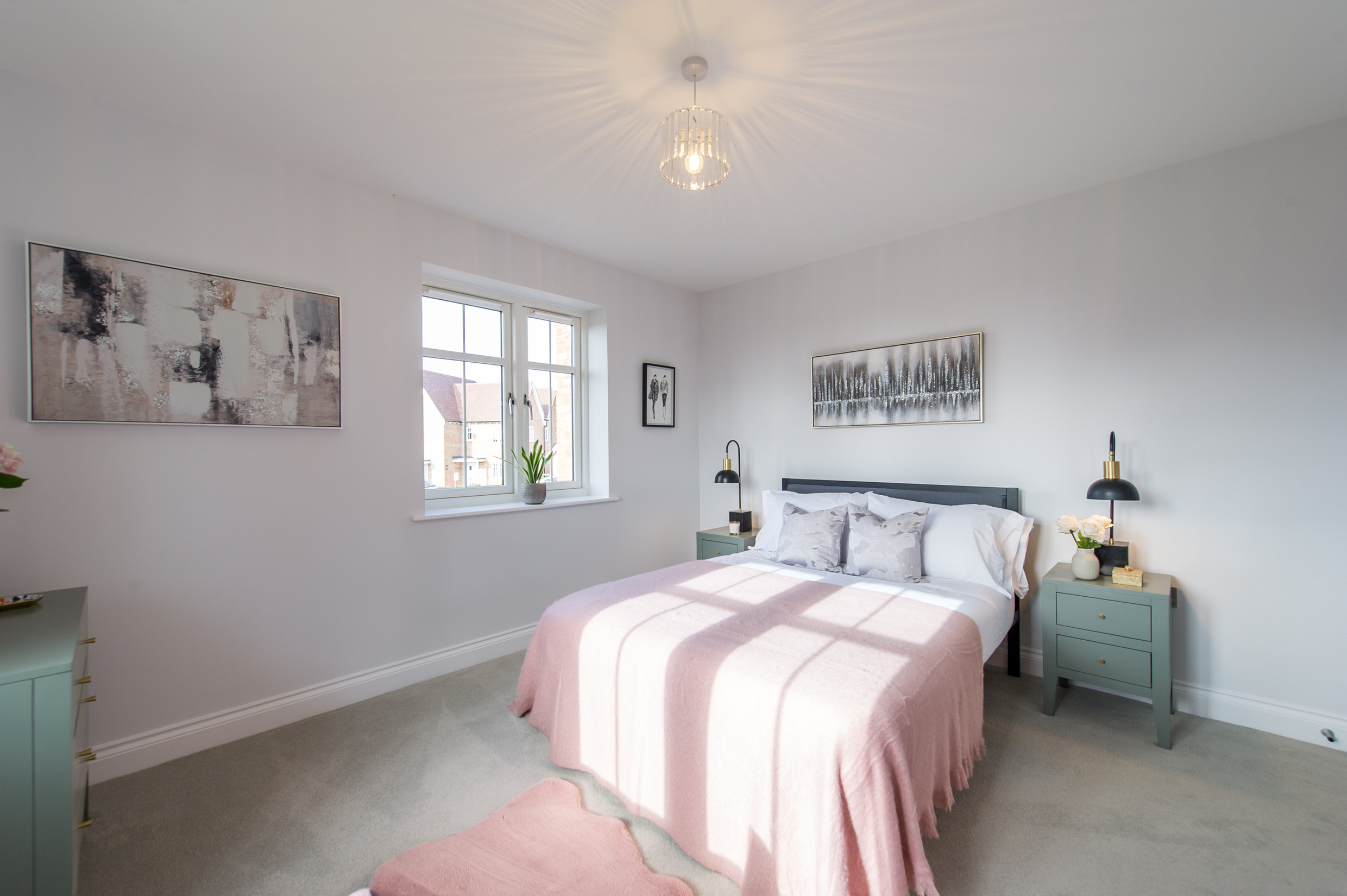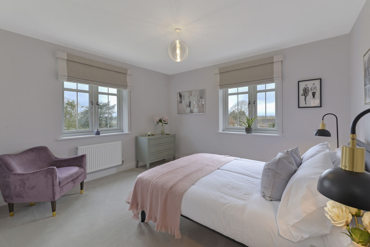 To complement the beautiful design of Fernham Homes’ Elm House, we blended both classic and contemporary pieces to create a feeling of warmth, whilst also achieving a modern, fresh feel to this spacious five bed new build property. The scheme is sophisticated yet homely, appealing to a range of buyers, with pops of colour and sumptuous textures throughout. Inspired by the property’s countryside setting, we included blue, green and mustard upholstery in living spaces and bedrooms, and introduced an autumnal vibe to keep the look seasonal and considered in time for a winter launch.