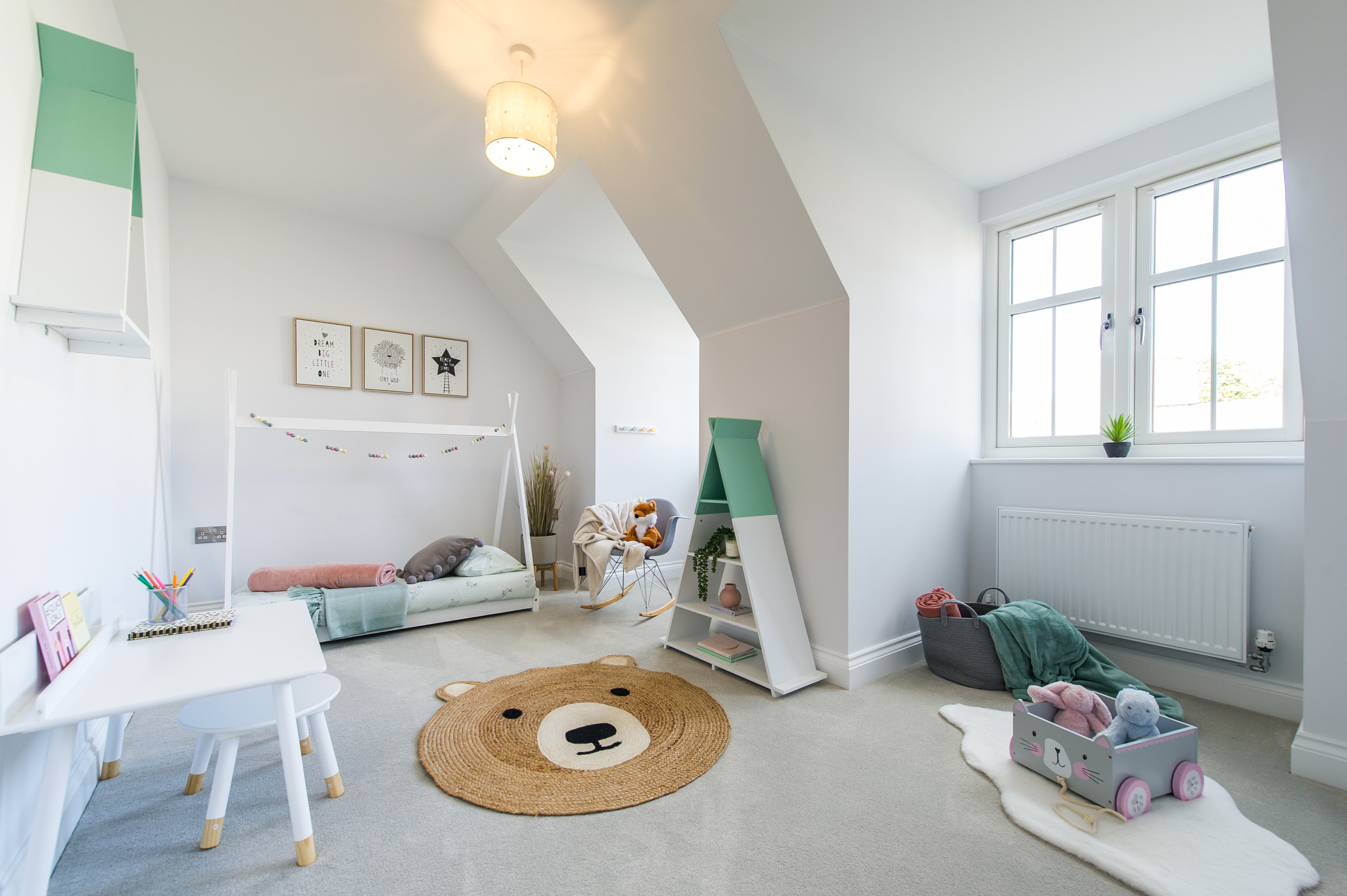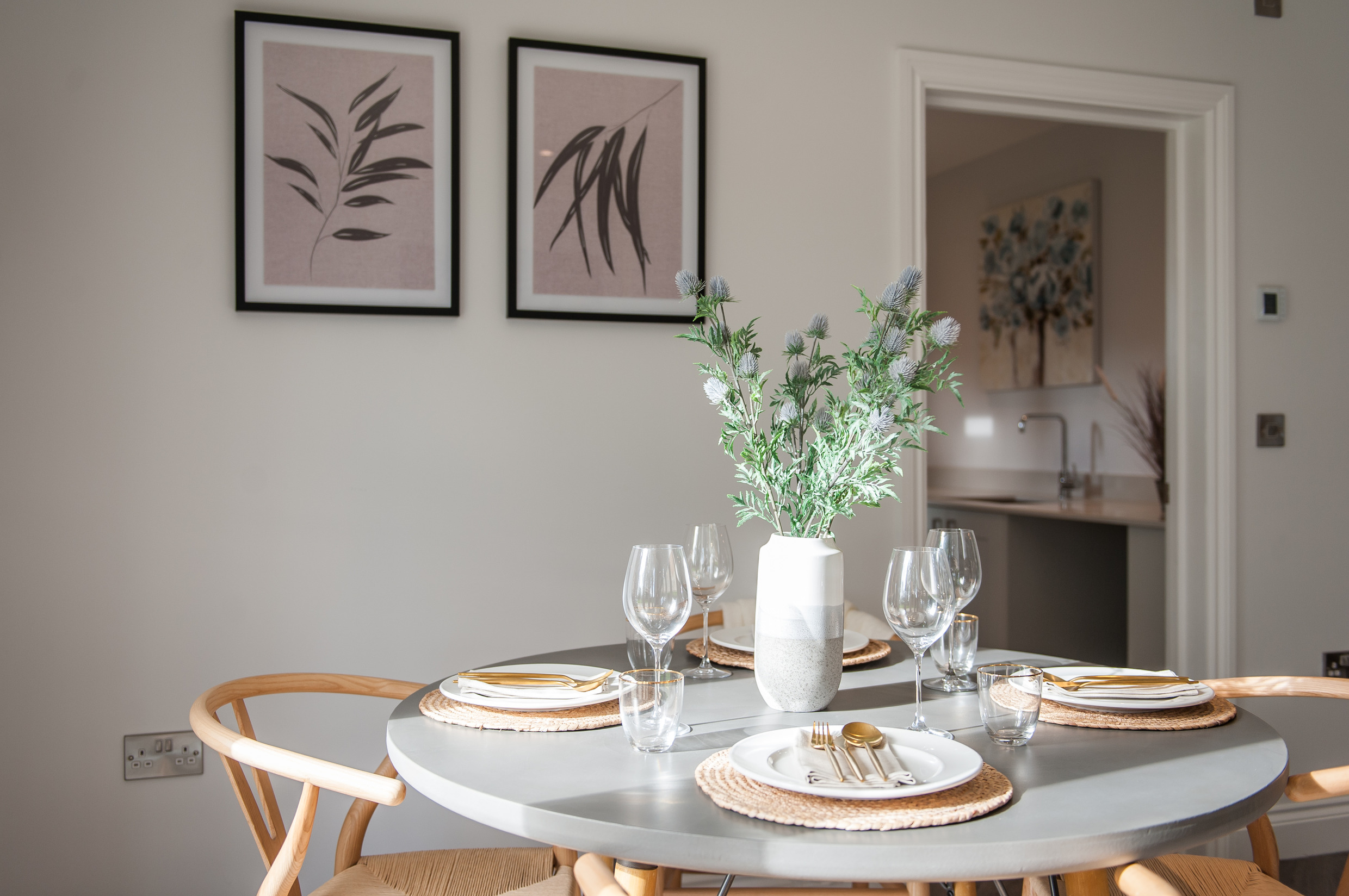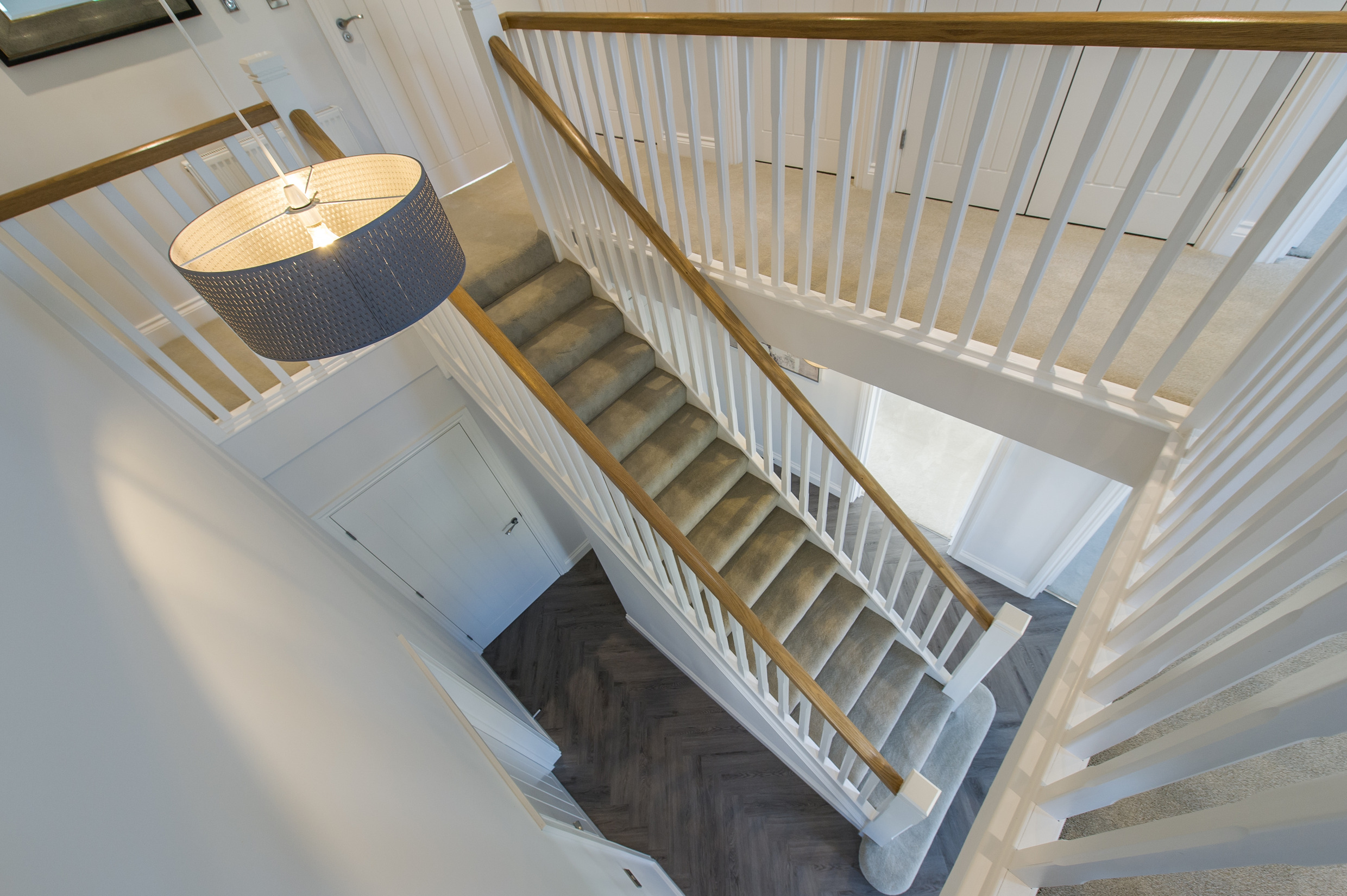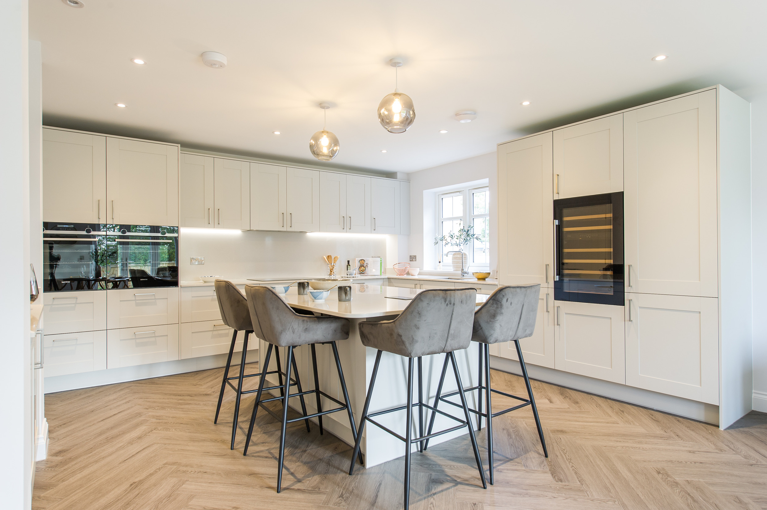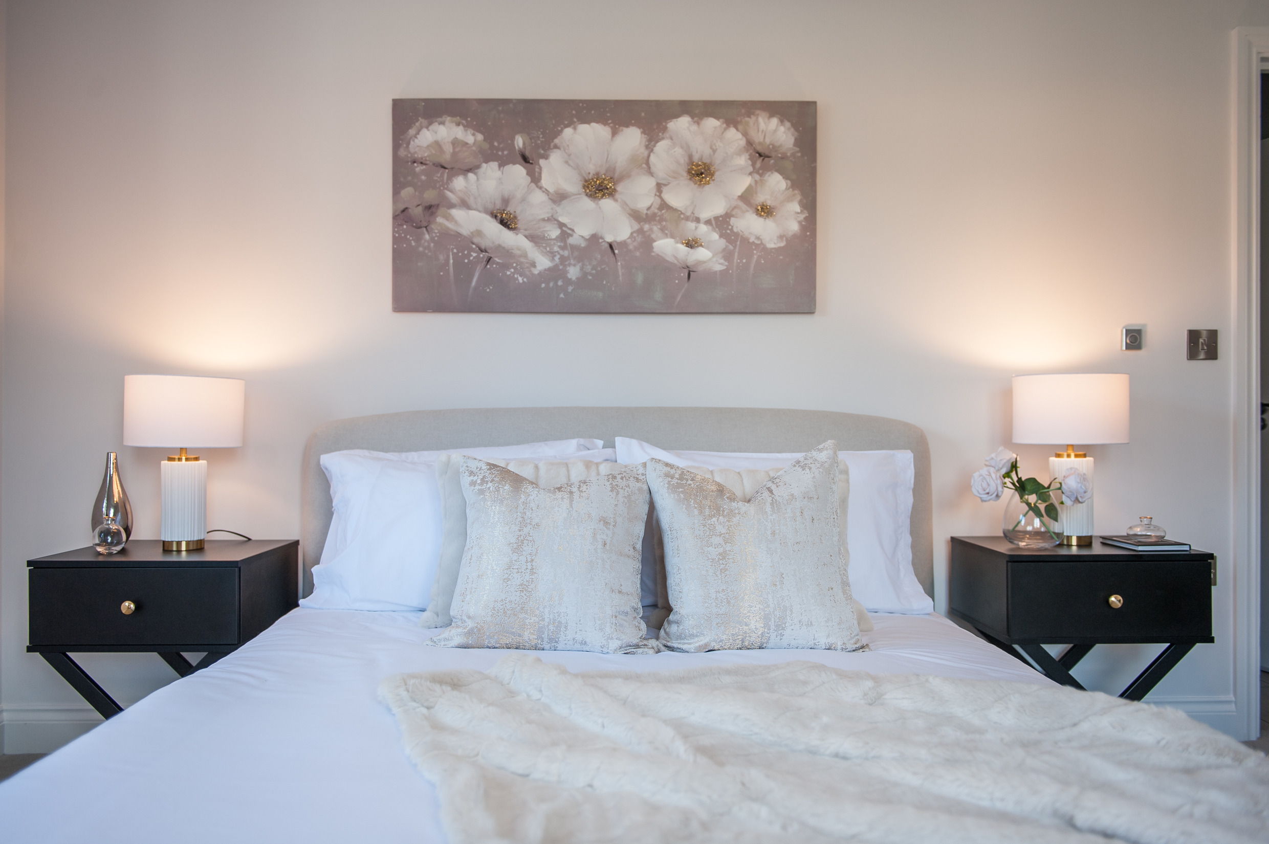 To complement the beautiful design of Fernham Homes’ Elm House, we blended both classic and contemporary pieces to create a feeling of warmth, whilst also achieving a modern, fresh feel to this spacious five bed new build property. The scheme is sophisticated yet homely, appealing to a range of buyers, with pops of colour and sumptuous textures throughout. Inspired by the property’s countryside setting, we included blue, green and mustard upholstery in living spaces and bedrooms, and introduced an autumnal vibe to keep the look seasonal and considered in time for a winter launch.