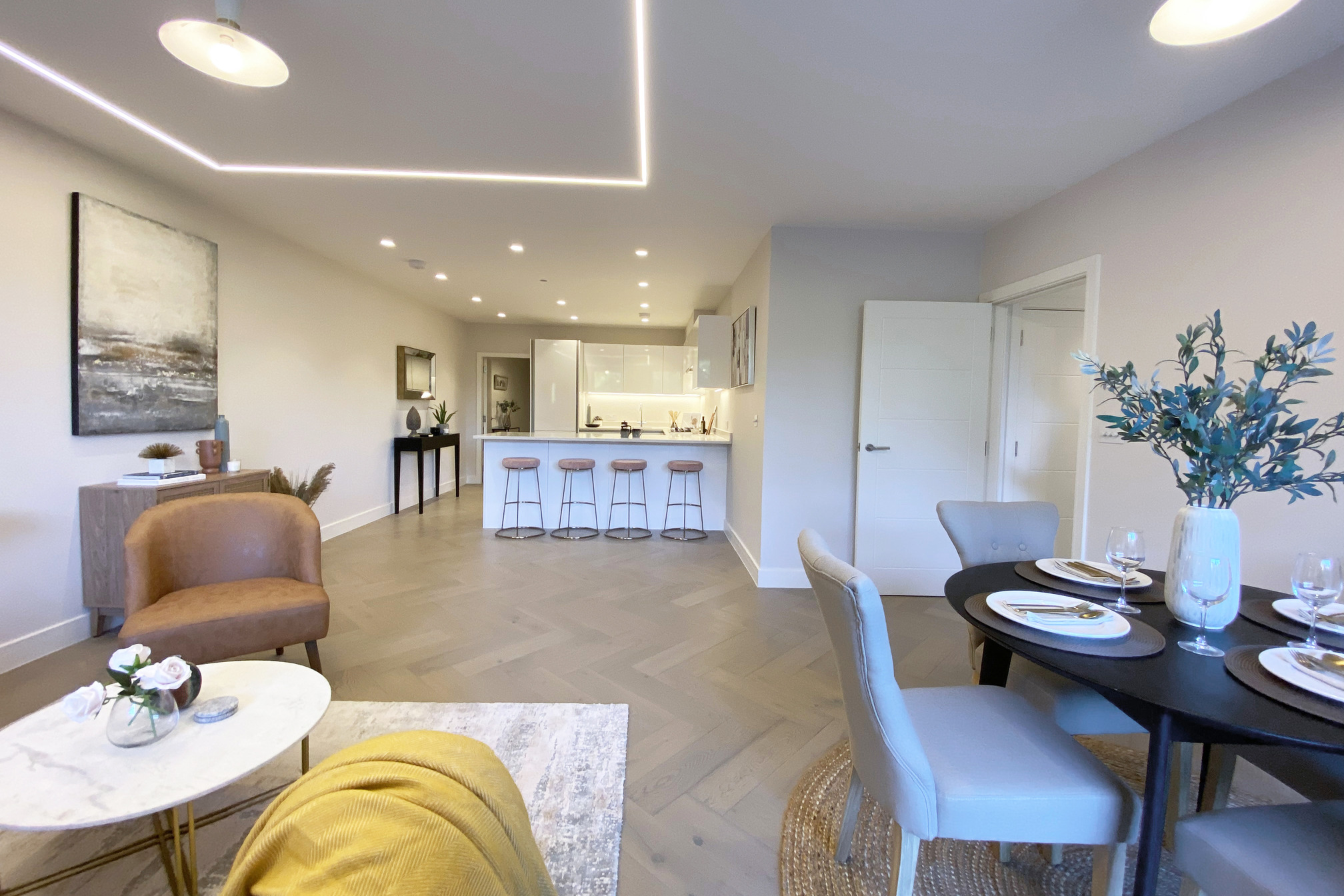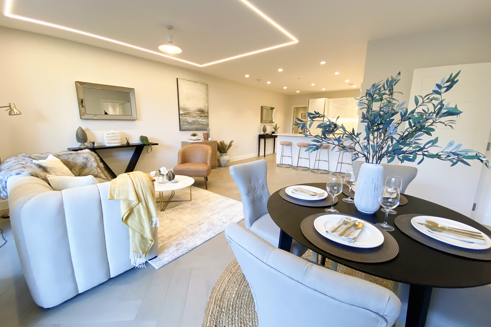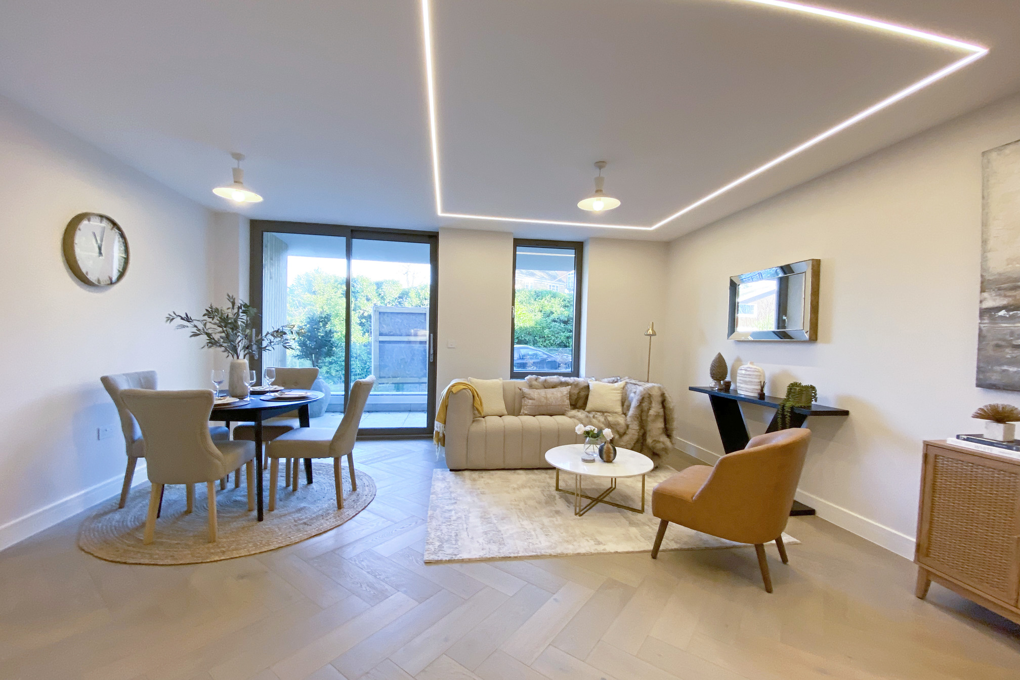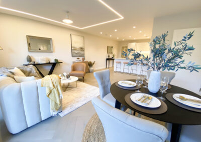 This stunning property is a ground floor apartment in this award winning development, benefitting from a grand, open plan living space and generous balcony. To complement the beautiful architecture we included a blend of natural materials and textures to curate a stylish home, whilst also zoning the kitchen and living space to include a formal dining area and relaxed seating zone. Statement curved pieces of furniture were hand picked to show off the soft, unique external design of the development, and the balcony was dressed to show off the outside space.