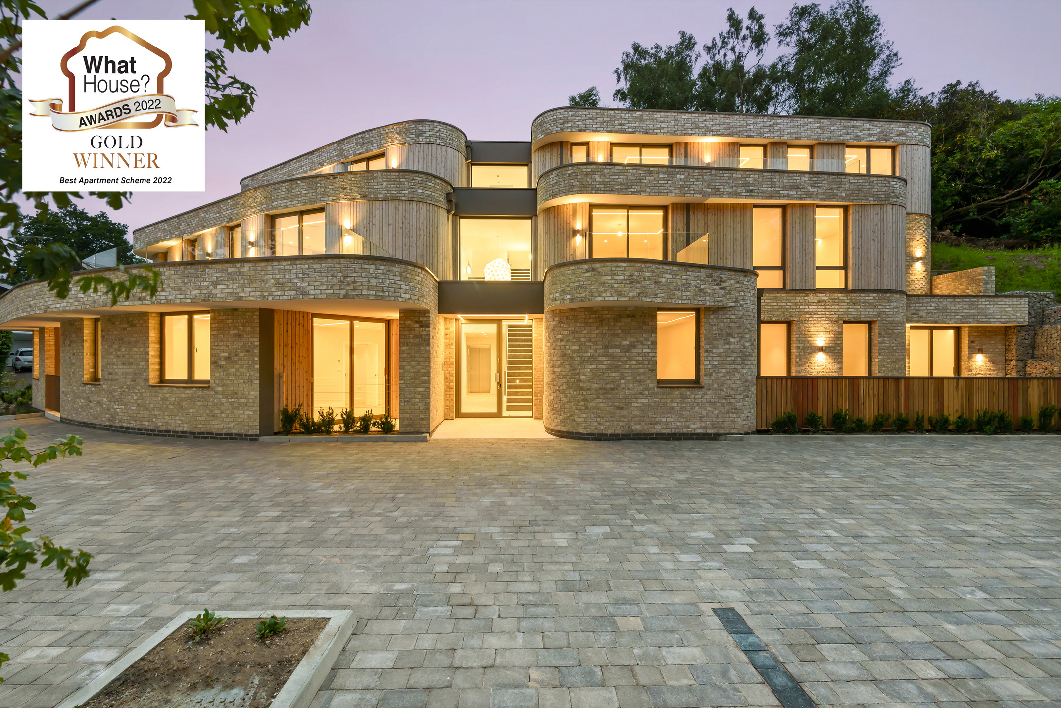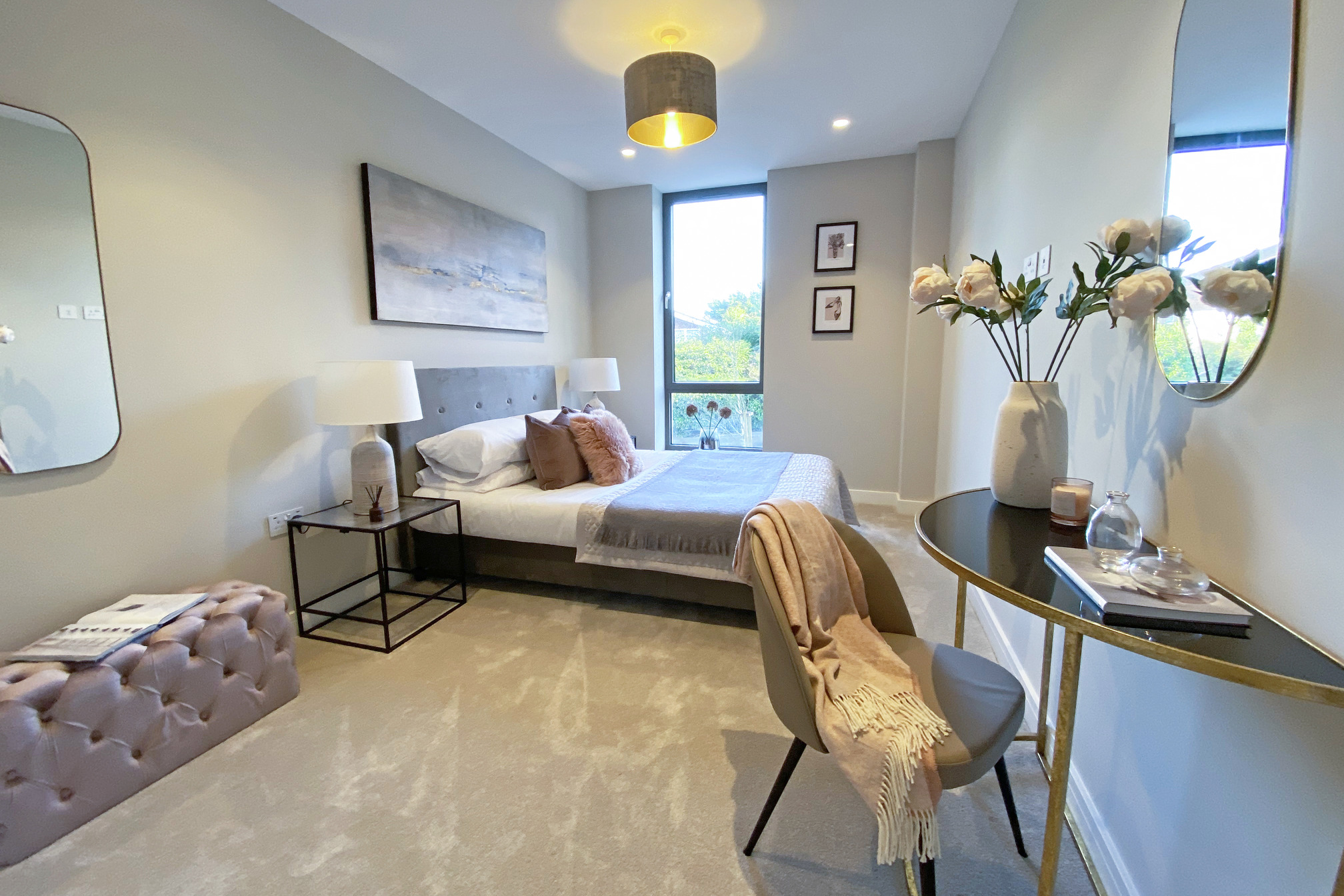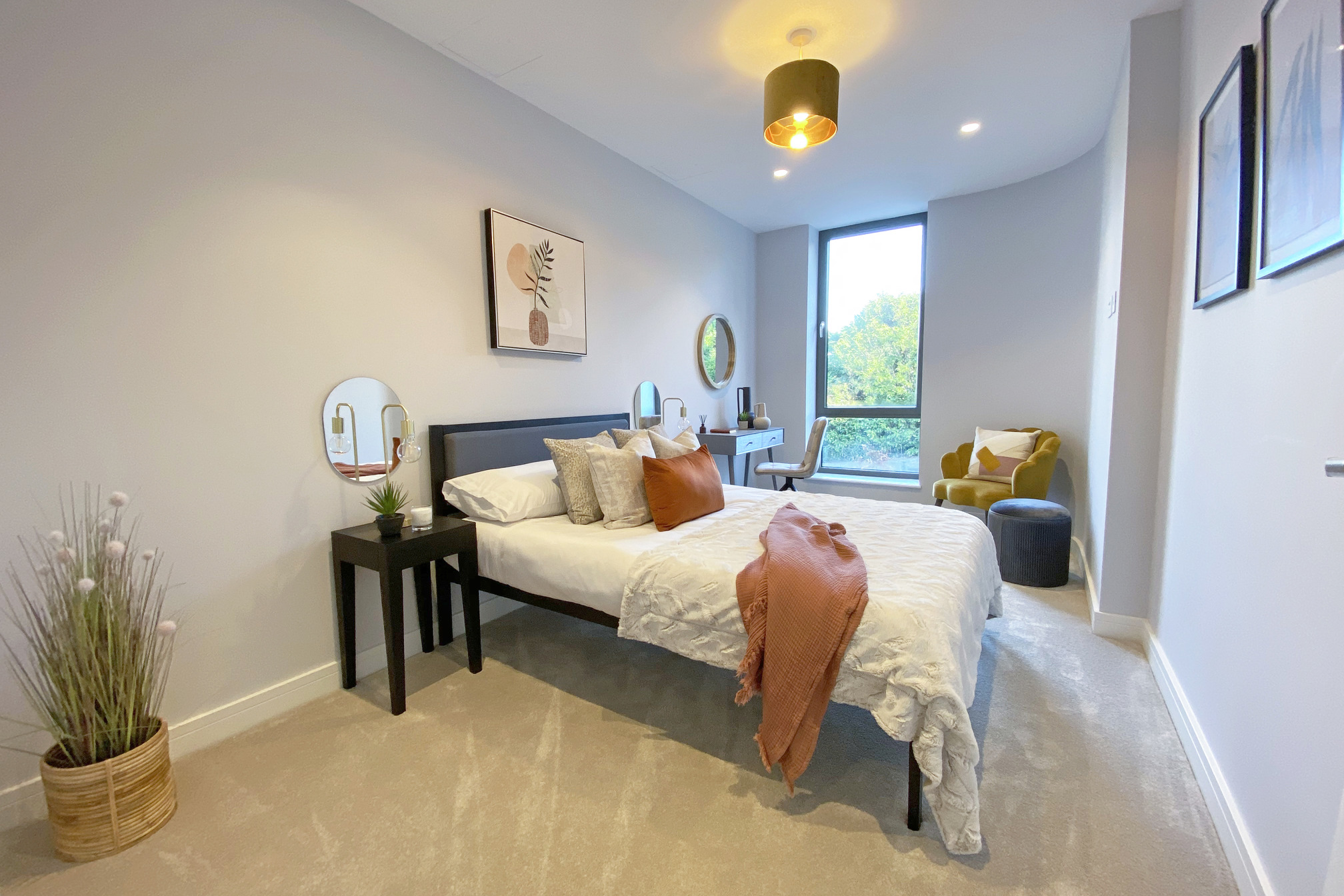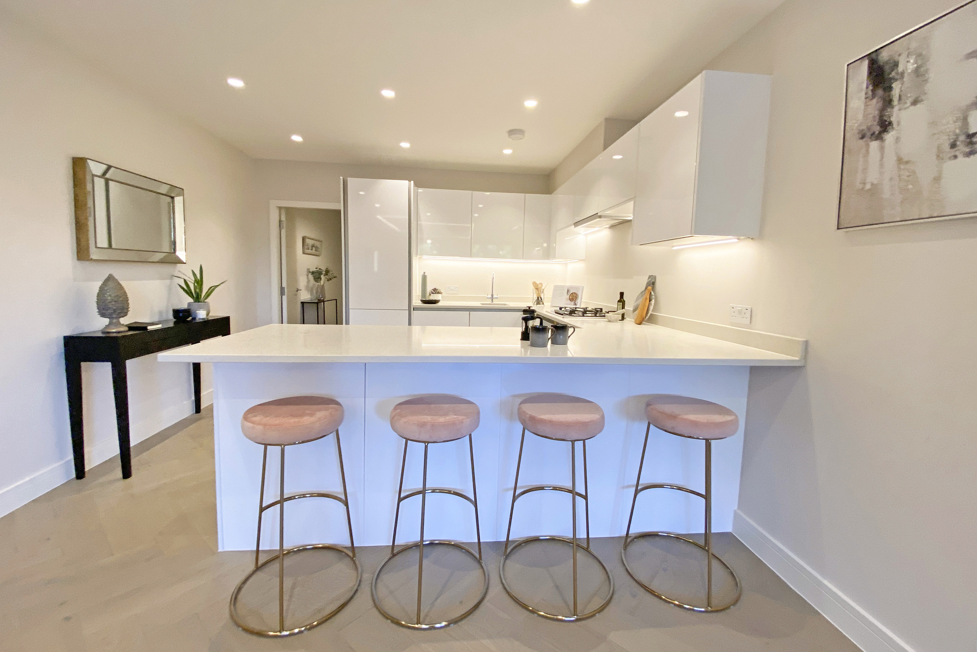 This stunning property is a ground floor apartment in this award winning development, benefitting from a grand, open plan living space and generous balcony. To complement the beautiful architecture we included a blend of natural materials and textures to curate a stylish home, whilst also zoning the kitchen and living space to include a formal dining area and relaxed seating zone. Statement curved pieces of furniture were hand picked to show off the soft, unique external design of the development, and the balcony was dressed to show off the outside space.