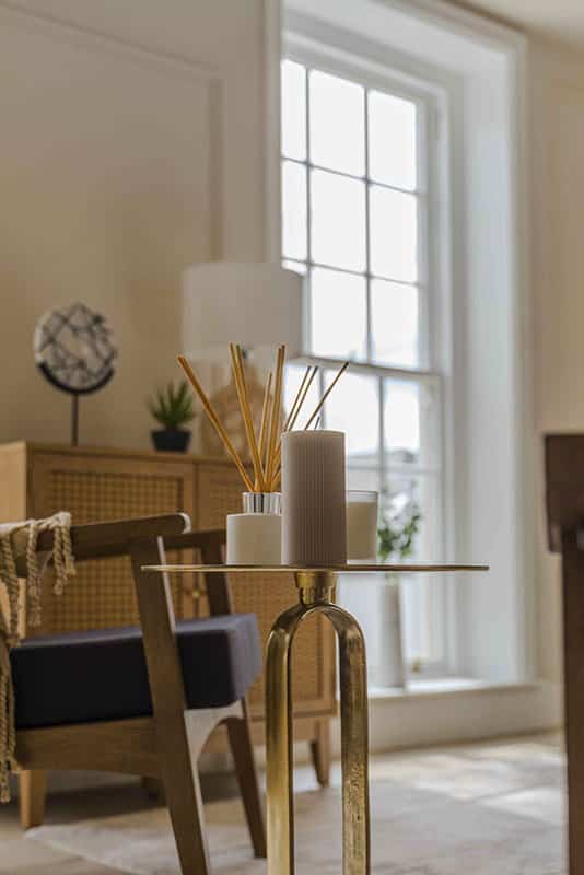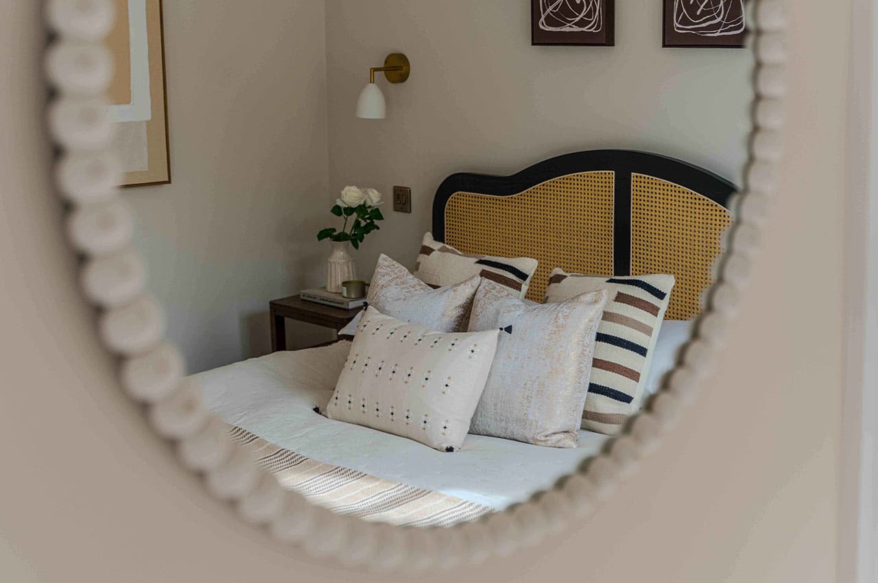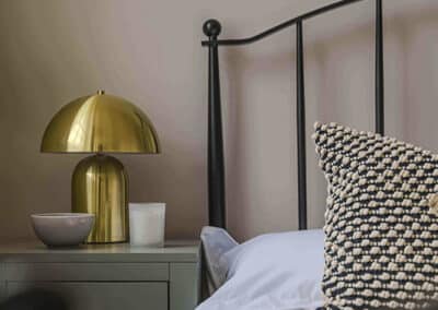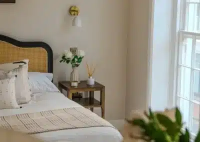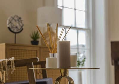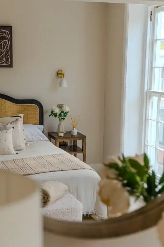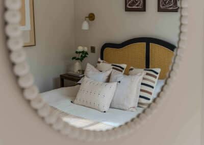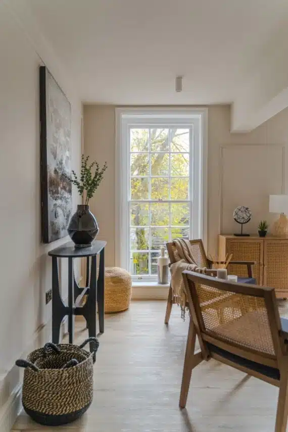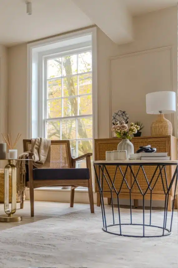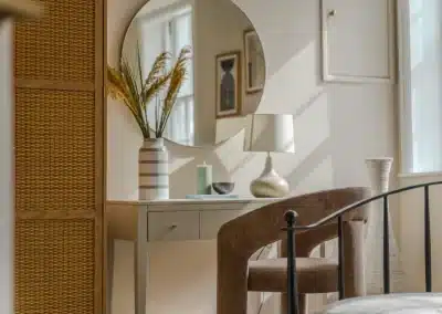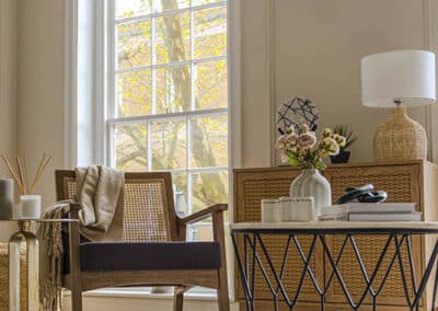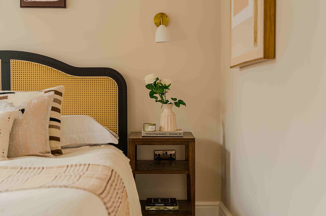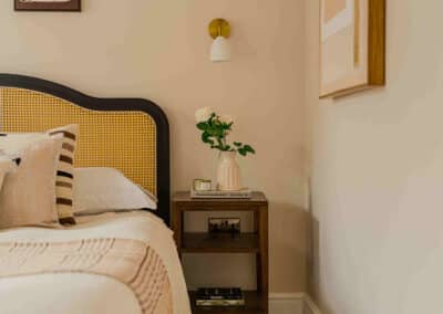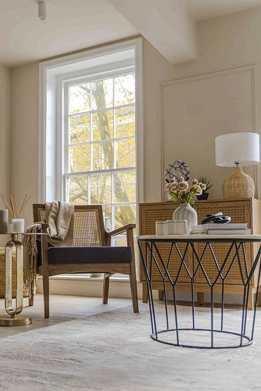Show home;The show home scheme in Flat 1 is warm and inviting, yet simplistic and neutral, to allow the property’s character features to take centre stage. Textured fabrics have been paired with statement oak and marble furniture to curate a considered look, whilst key pieces, such as a cane master bed and boucle sofa, have been handpicked to add a contemporary feel amongst this traditional setting. Hints of terracotta and earthy shades throughout bring warmth to the scheme, whilst statement abstract art injects further colour. Linens, velvets & wool fabrics combine to achieve a layered, homely and stylish feel for this unique apartment.