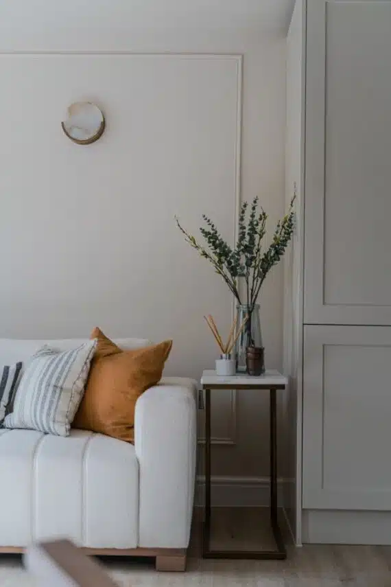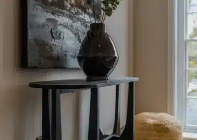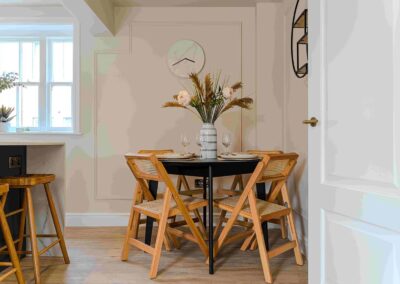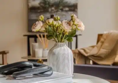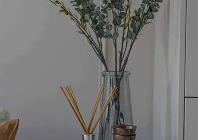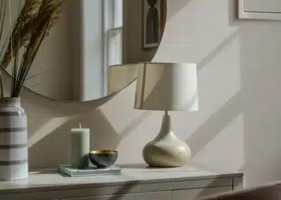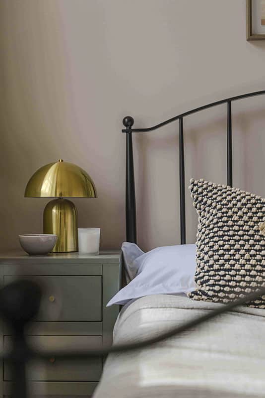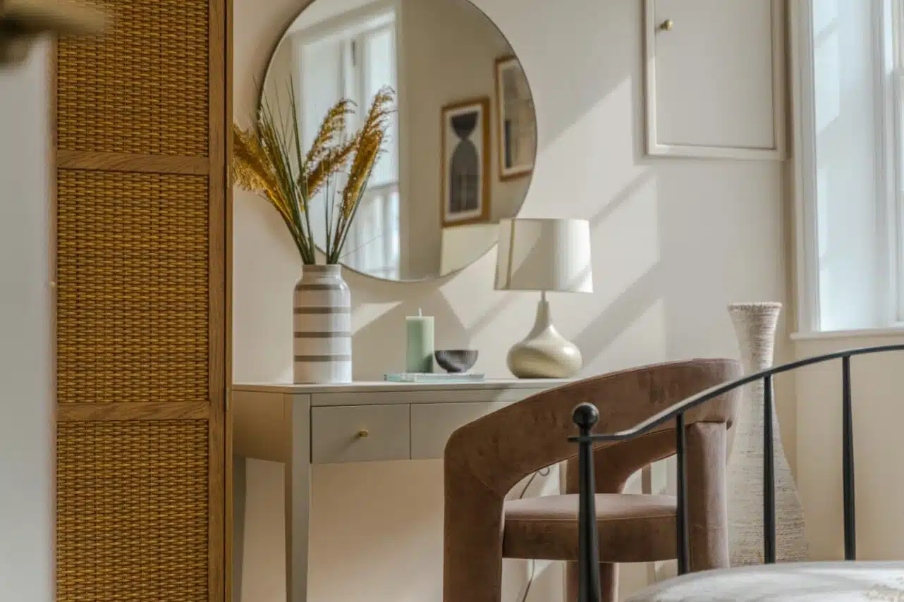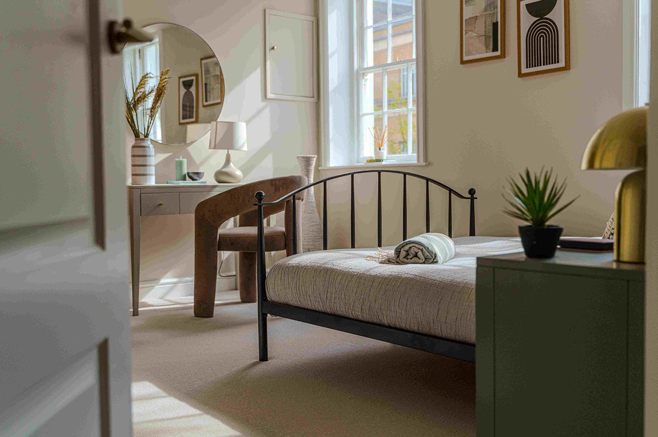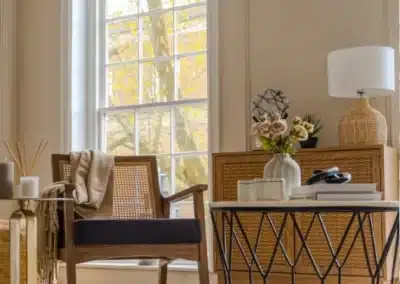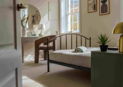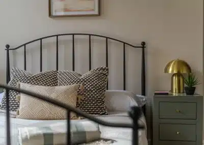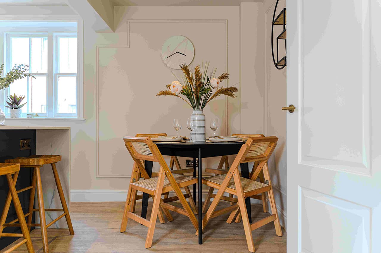 Show home;The show home scheme in Flat 1 is warm and inviting, yet simplistic and neutral, to allow the property’s character features to take centre stage. Textured fabrics have been paired with statement oak and marble furniture to curate a considered look, whilst key pieces, such as a cane master bed and boucle sofa, have been handpicked to add a contemporary feel amongst this traditional setting. Hints of terracotta and earthy shades throughout bring warmth to the scheme, whilst statement abstract art injects further colour. Linens, velvets & wool fabrics combine to achieve a layered, homely and stylish feel for this unique apartment.