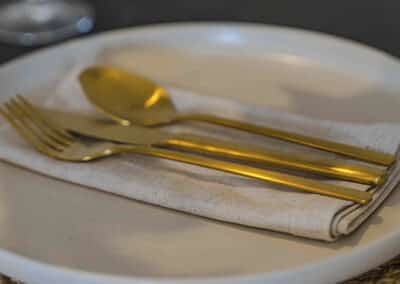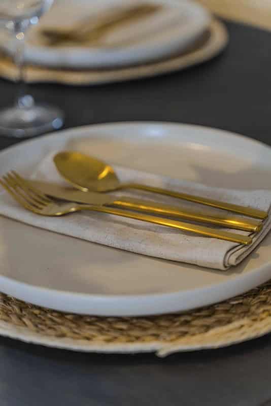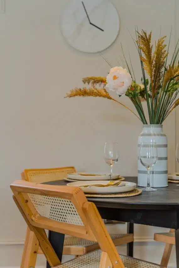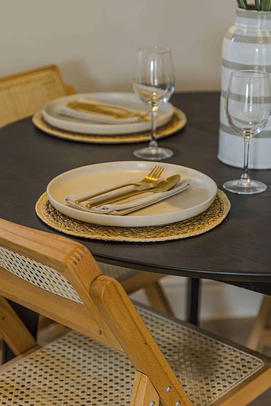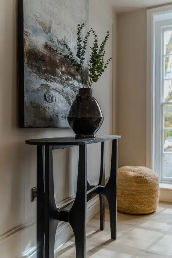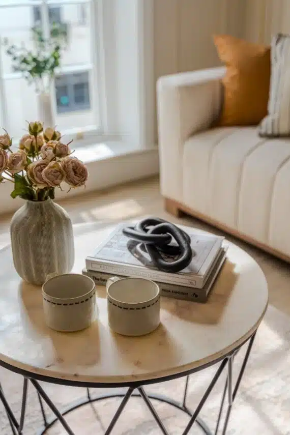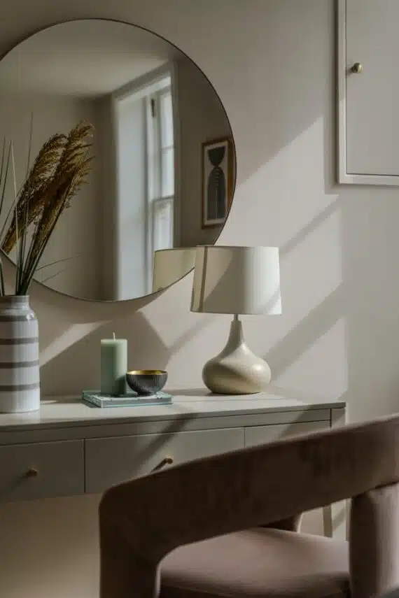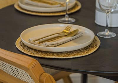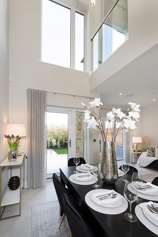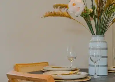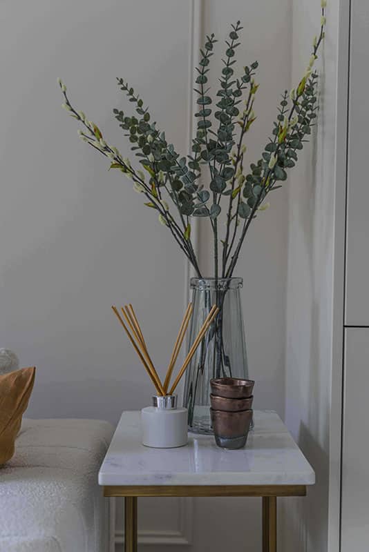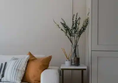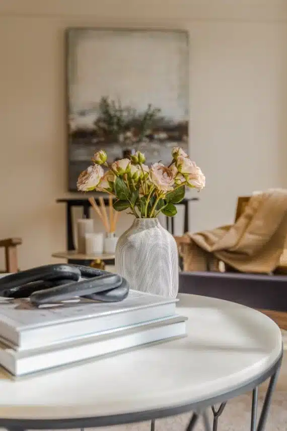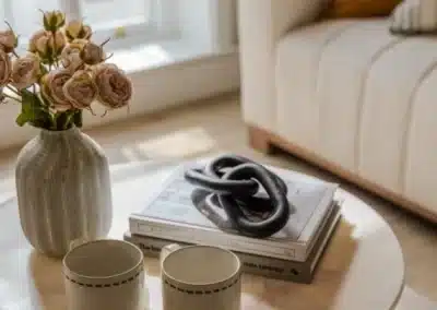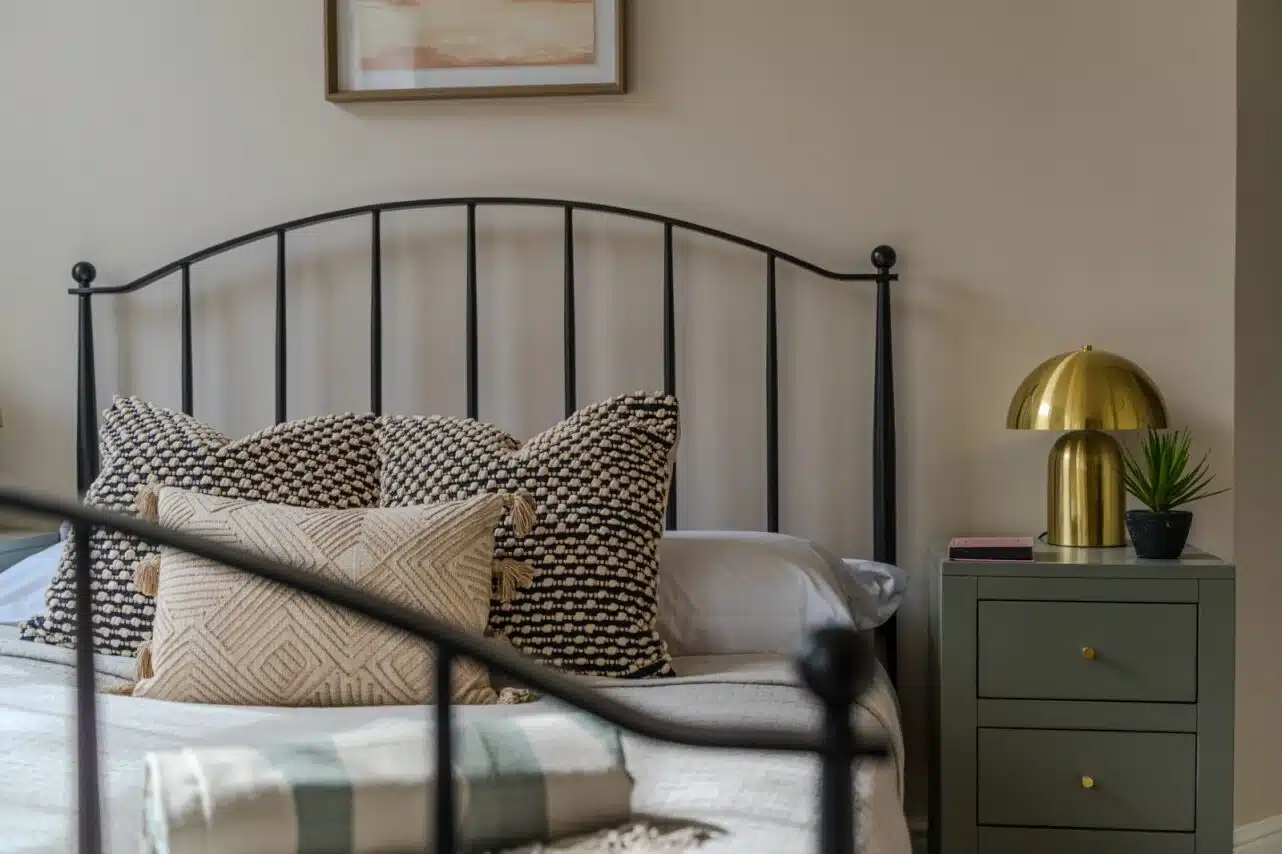 Show home;The show home scheme in Flat 1 is warm and inviting, yet simplistic and neutral, to allow the property’s character features to take centre stage. Textured fabrics have been paired with statement oak and marble furniture to curate a considered look, whilst key pieces, such as a cane master bed and boucle sofa, have been handpicked to add a contemporary feel amongst this traditional setting. Hints of terracotta and earthy shades throughout bring warmth to the scheme, whilst statement abstract art injects further colour. Linens, velvets & wool fabrics combine to achieve a layered, homely and stylish feel for this unique apartment.