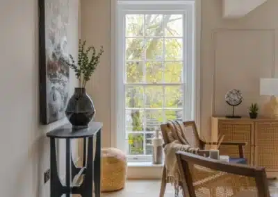 Interior design; This Grade II listed property has been extensively renovated by the Beau Property team to curate apartment living at its best, combining character features with a modern interiors touch. The new layout includes two generous double bedrooms, a luxurious bathroom and a beautiful contemporary open plan kitchen and living space, with separate utility room. The interior palette is neutral, calming and sophisticated, with a warm tone colour drenching the walls and ceilings to create a cosy, homely feel – whilst traditional panelling complements the history of the property, and statement marble wall lighting elevates the overall look. The interior finishes include oak effect flooring, marble effect bathroom tiles and modern goods, brass hardware throughout, and a classic Shaker style kitchen with striking marble effect quartz.