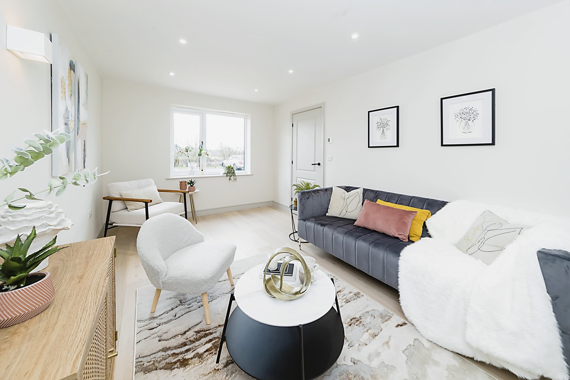 Professionally staged home by Beau Property Home Staging. Show home lounge featuring staged sofa with cushions & throw. decorative ornament on the coffee table.